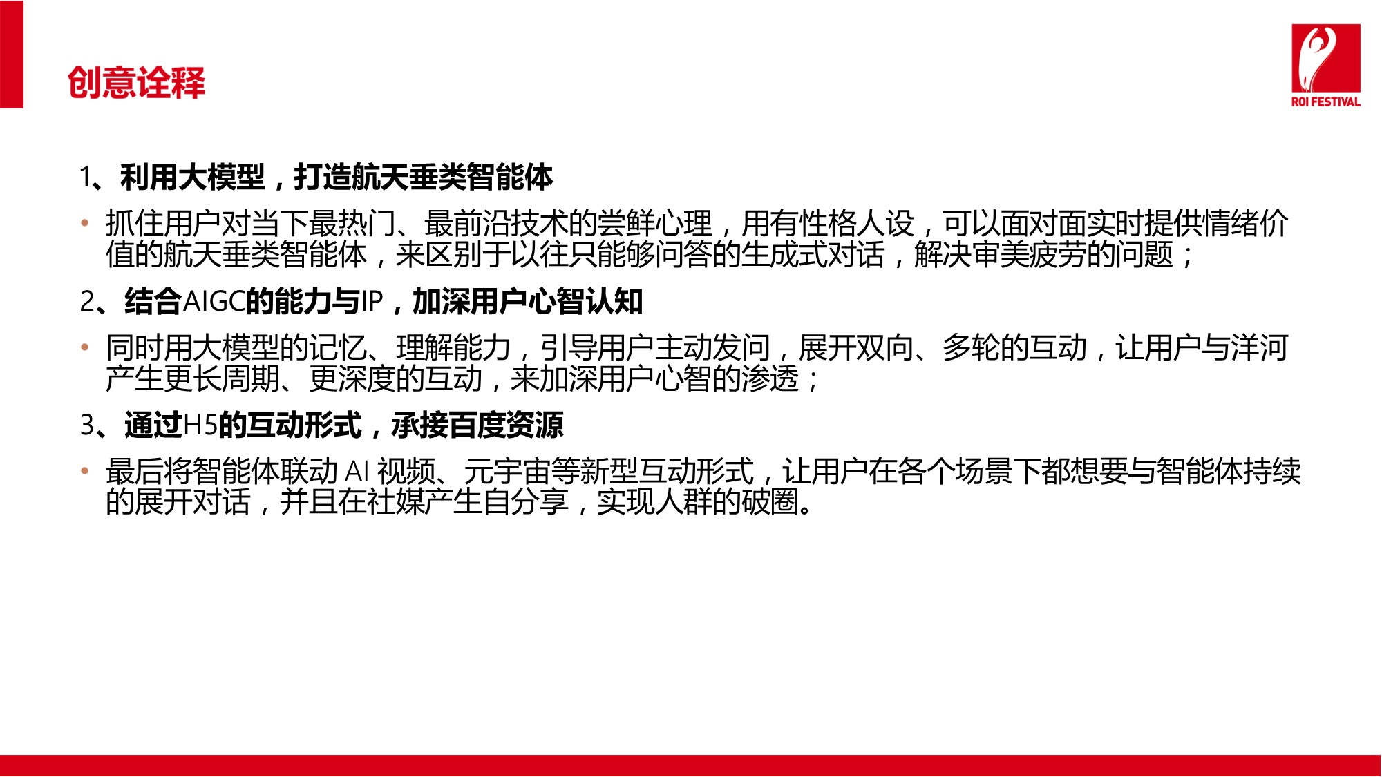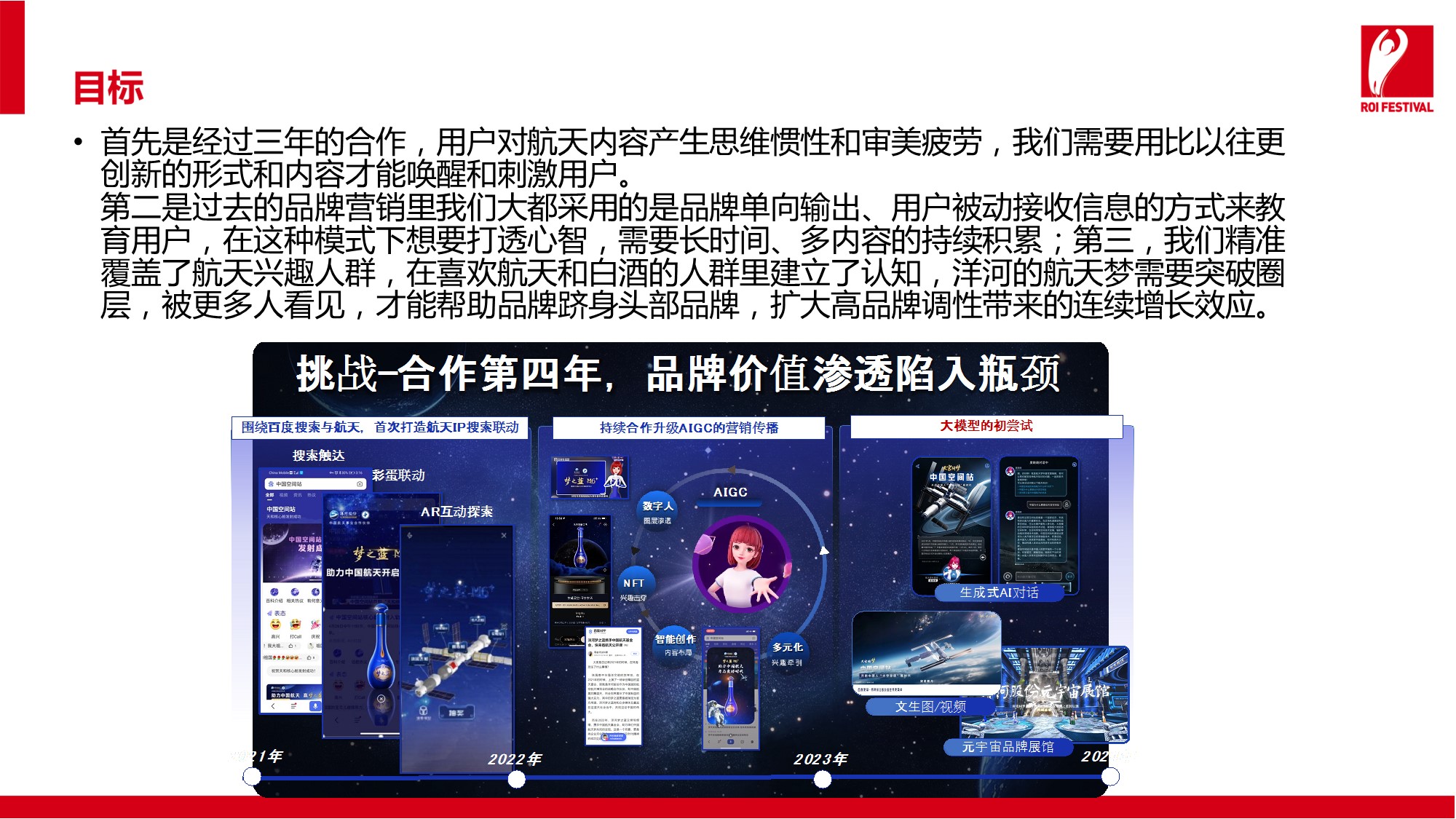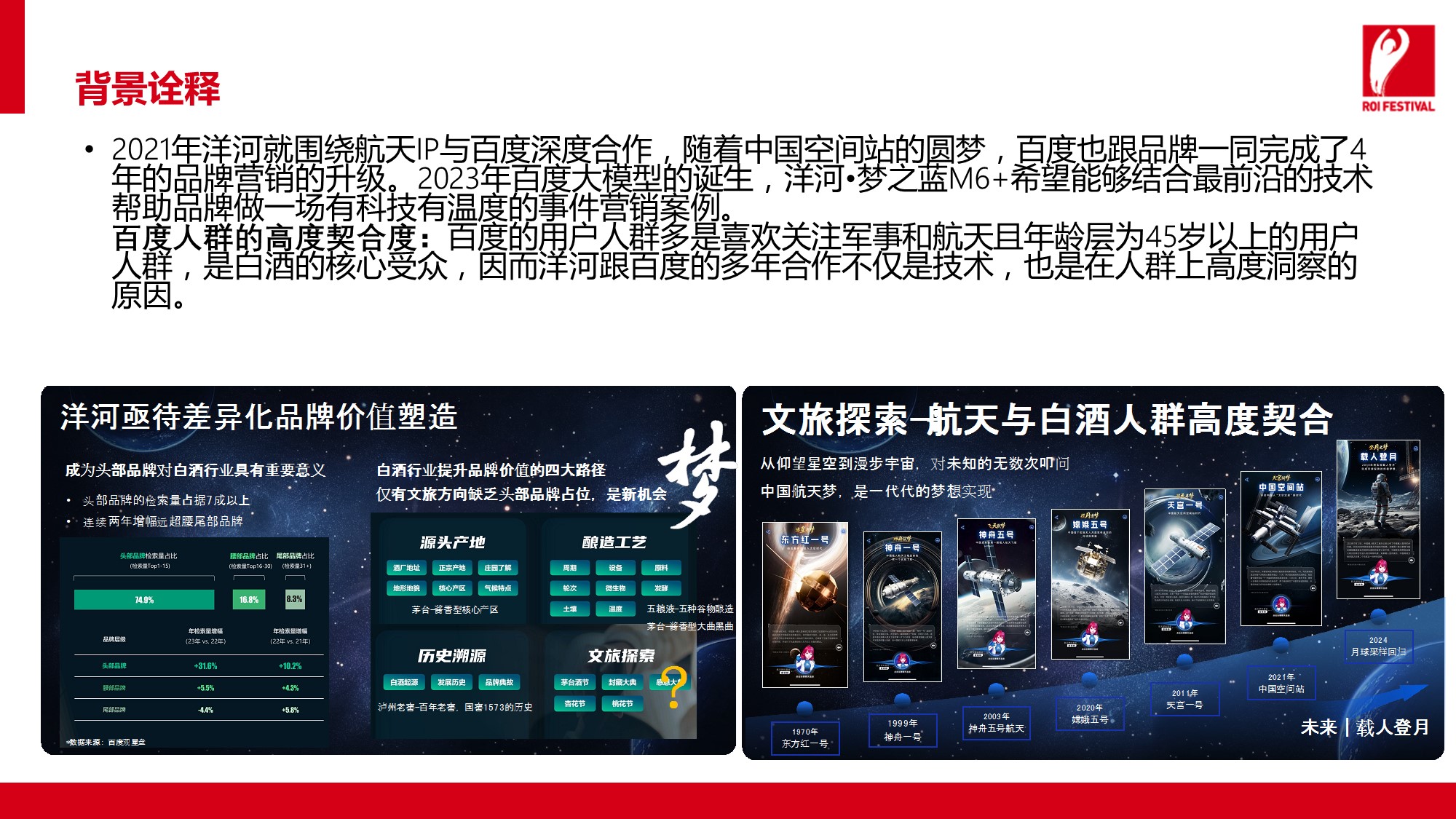 2021年洋河就围绕航天IP与百度深度合作,随着中国空间站的圆梦,百度也跟品牌一同完成了4年的品牌营销的升级。2023年百度大模型的诞生,洋河•梦之蓝M6+希望能够结合最前沿的技术帮助品牌做一场有科技有温度的事件营销案例。