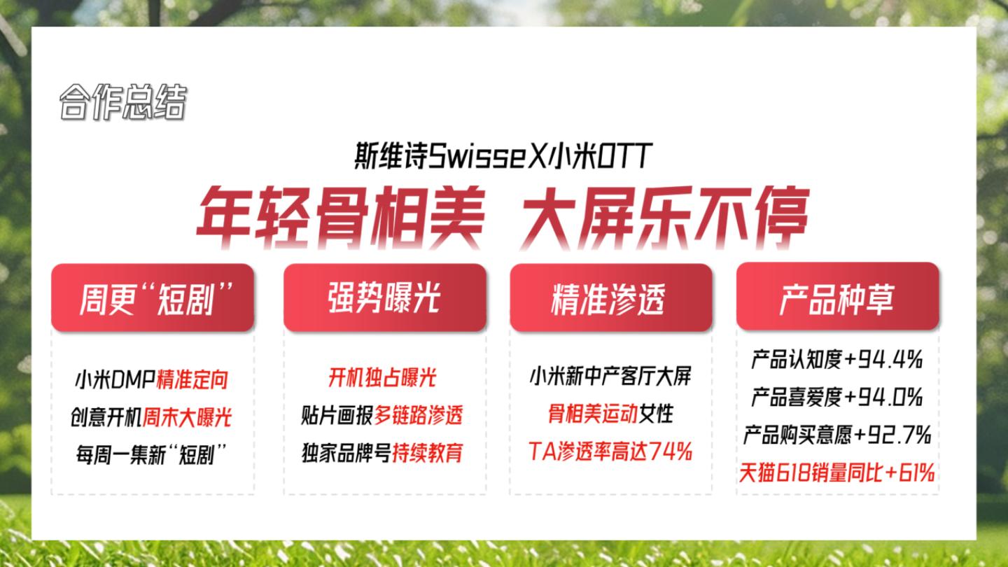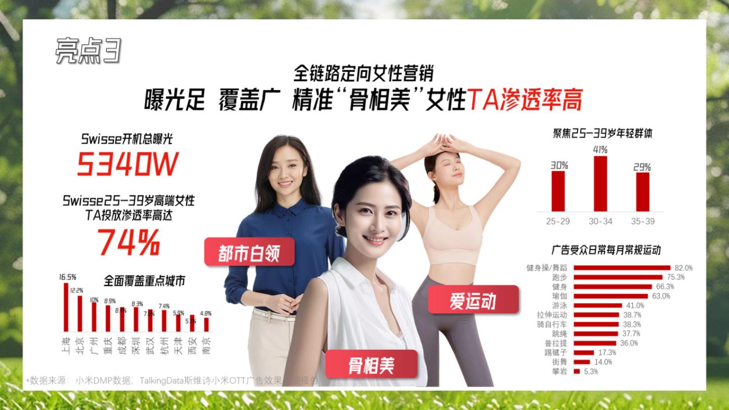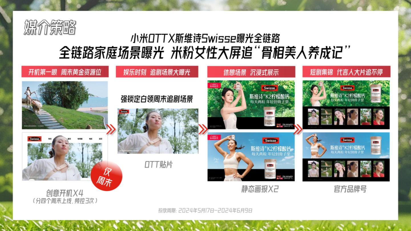 【强化高端定位】选择小米OTT提高投放质量与环境。签约品牌形象大使郑钦文和周也,利用明星形象传递Swisse高端和专业形象。