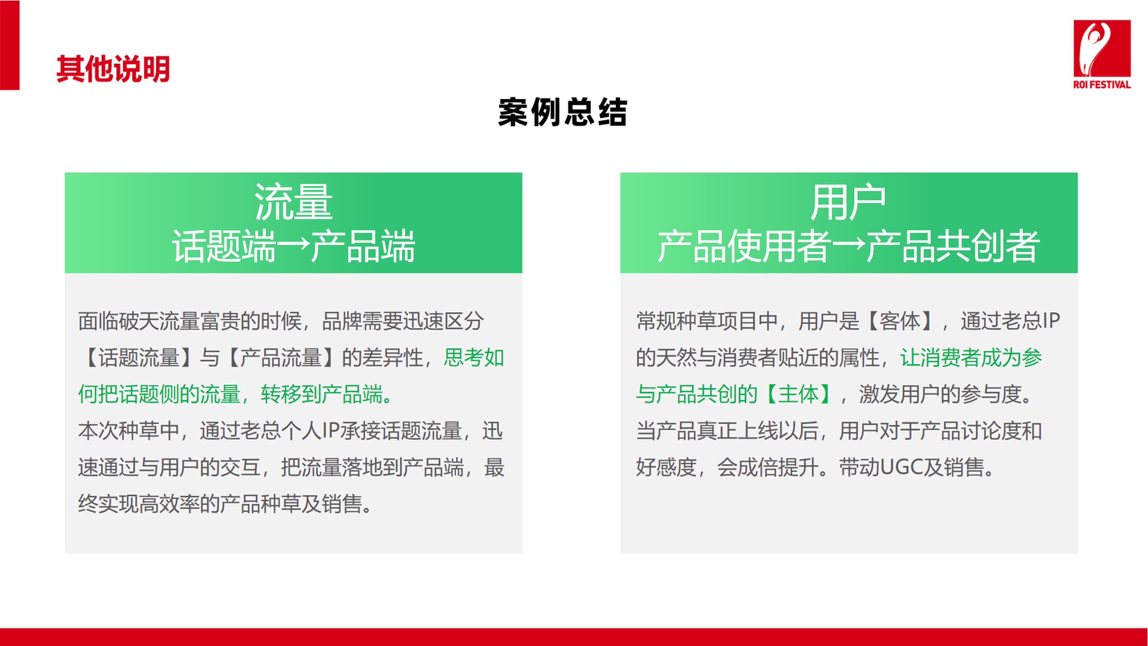 面临破天流量富贵的时候,品牌需要迅速区分【话题流量】与【产品流量】的差异性,思考如何把话题侧的流量,转移到产品端。常规种草项目中,用户是【客体】,通过老总IP的天然与消费者贴近的属性,让消费者成为参与产品共创的【主体】,激发用户的参与度。当产品真正上线以后,用户对于产品讨论度和好感度,会成倍提升,带动UGC及销售。