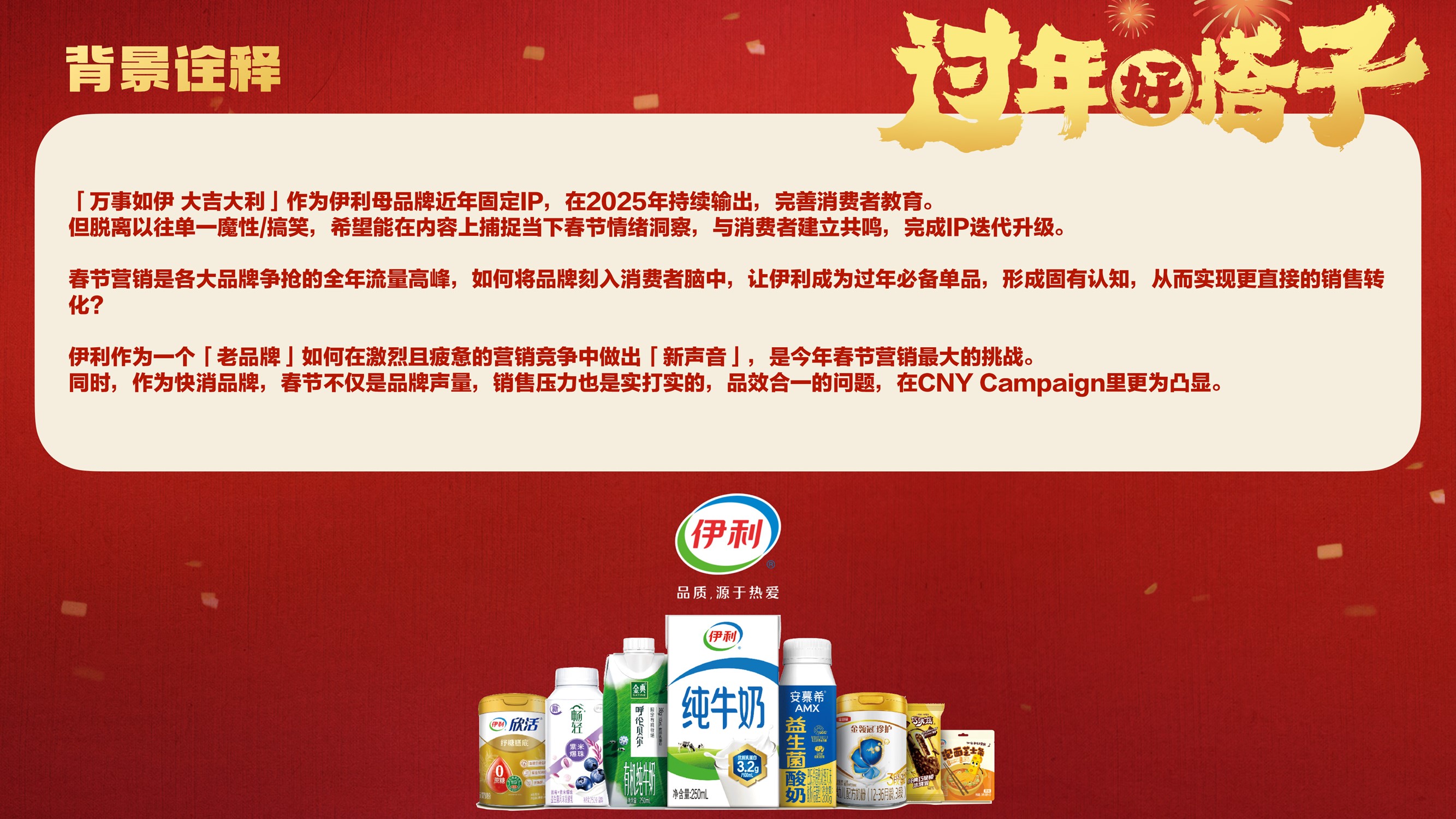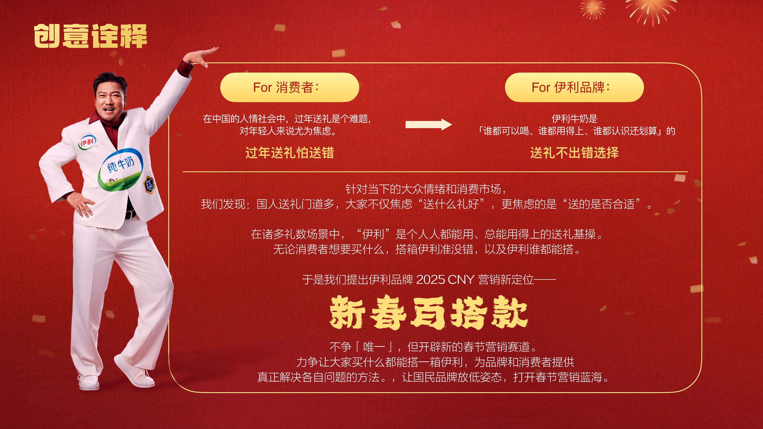 因此,我们提出伊利 2025 CNY 营销新定位——过年百搭款,不争「唯一」,但力图让消费者无论送什么都能搭一箱伊利,开辟春节送礼新赛道。
