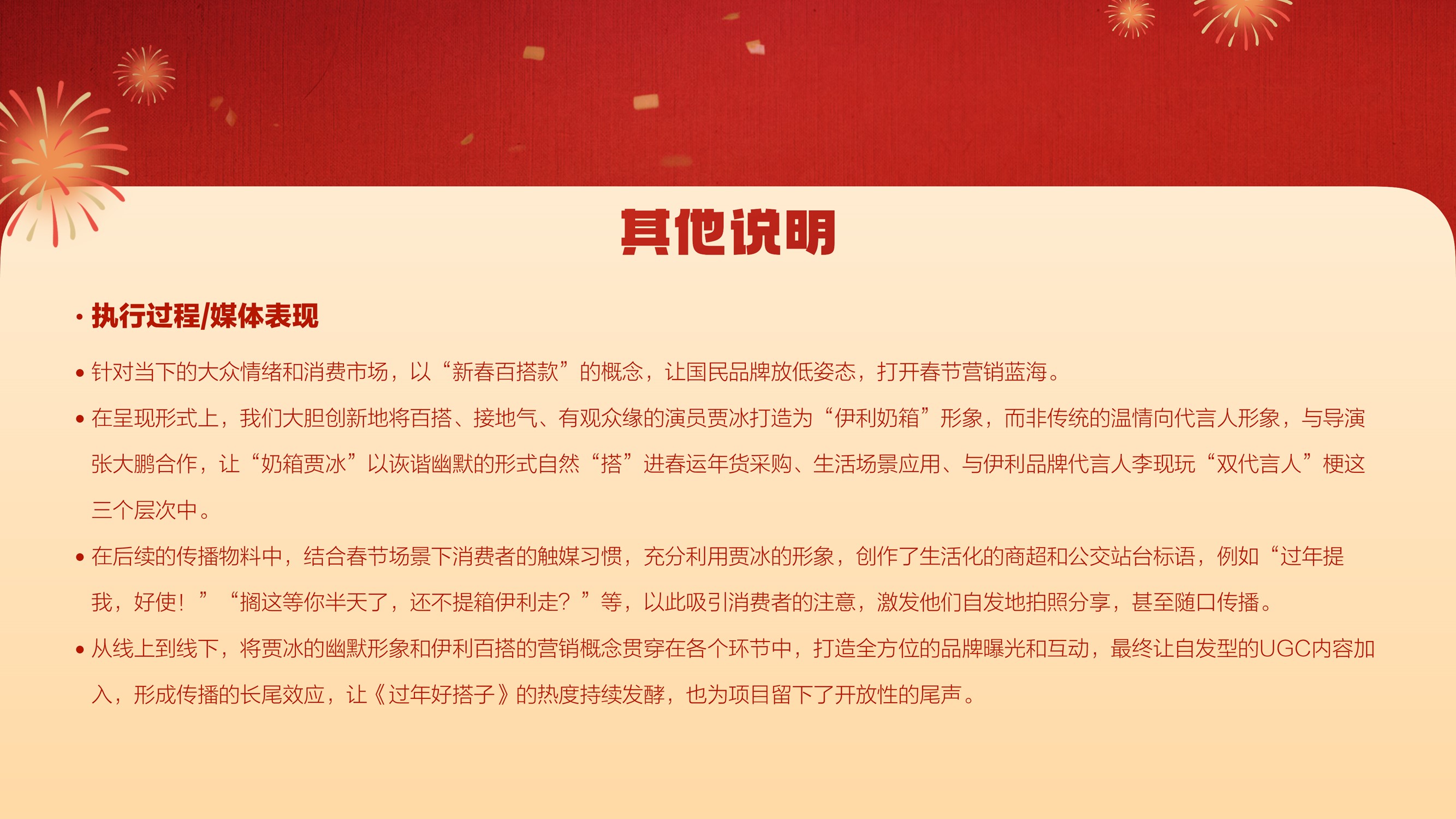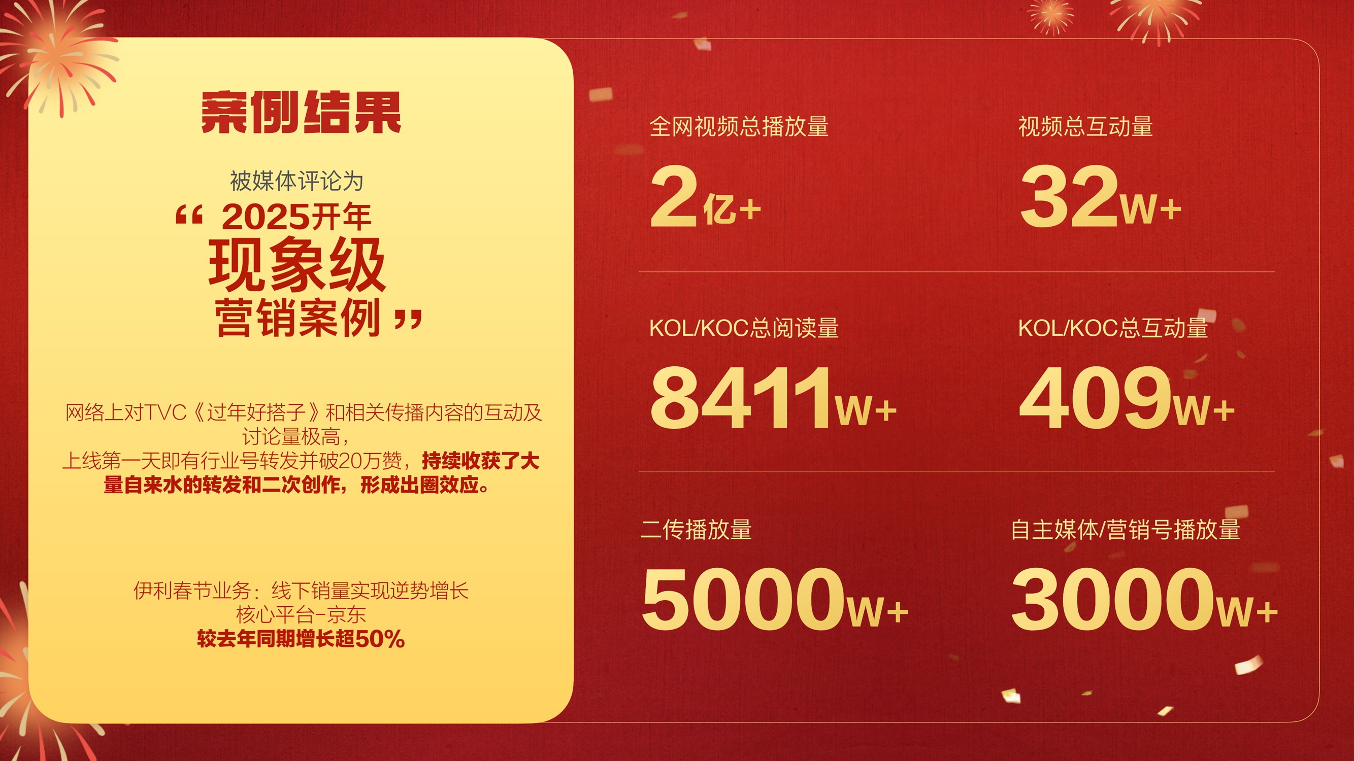 通过本次项目的传播,强化了伊利是过年搭子的用户心智,借力抢占了春节礼赠赛道,为伊利在春节期间带来了广泛的品牌好感和可观的业绩增长。