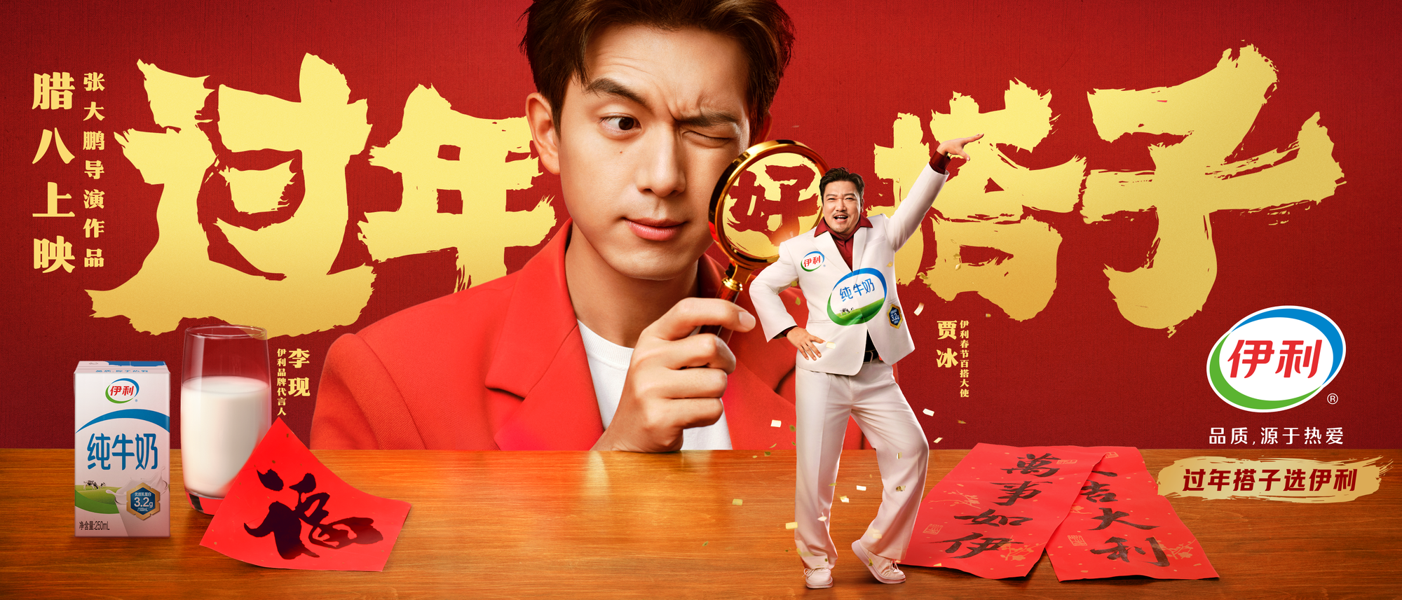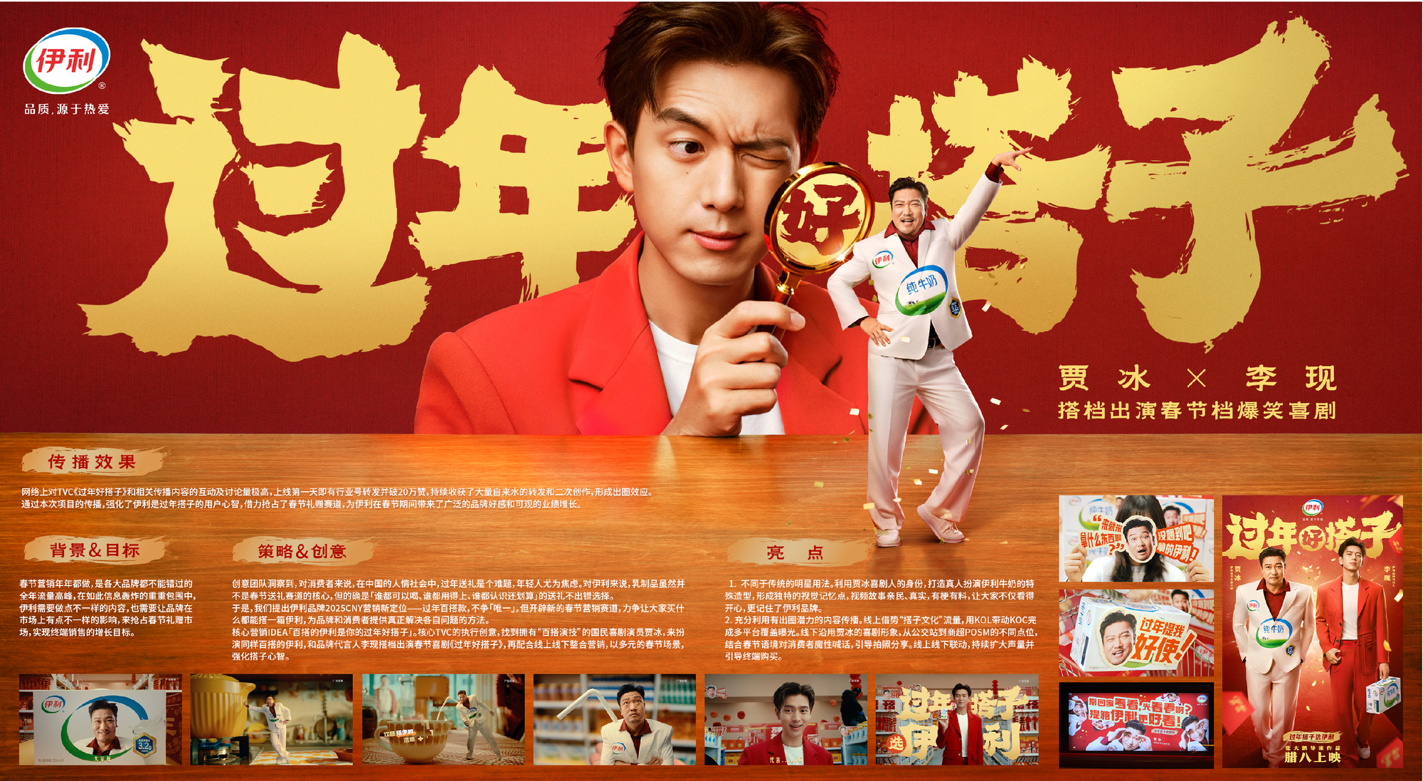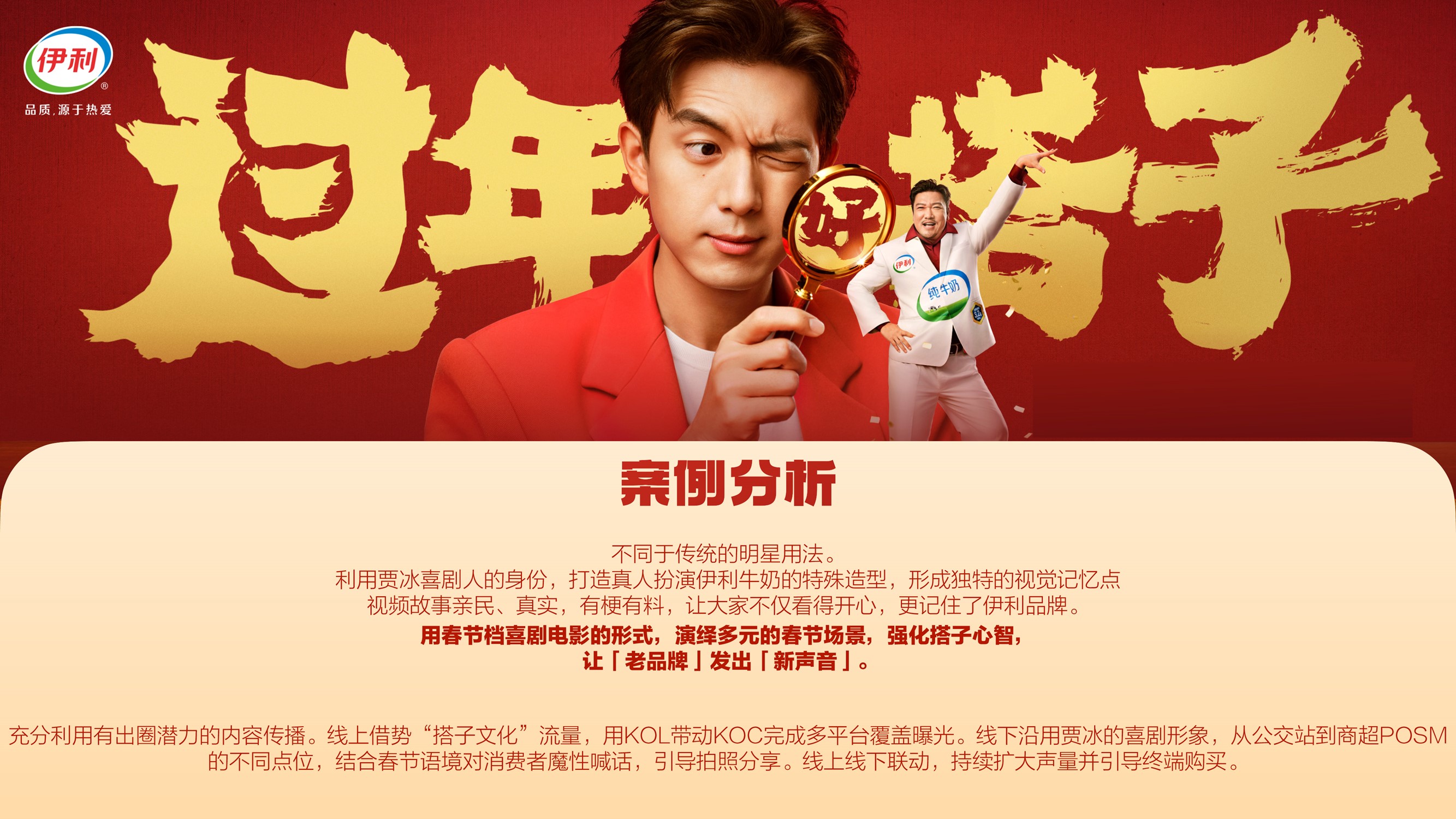 核心营销 IDEA 是「百搭的伊利是你的过年好搭子」,邀请百搭演员贾冰与代言人李现合作出演春节喜剧《过年好搭子》,并通过线上线下整合传播,打造多元场景,强化搭子心智。