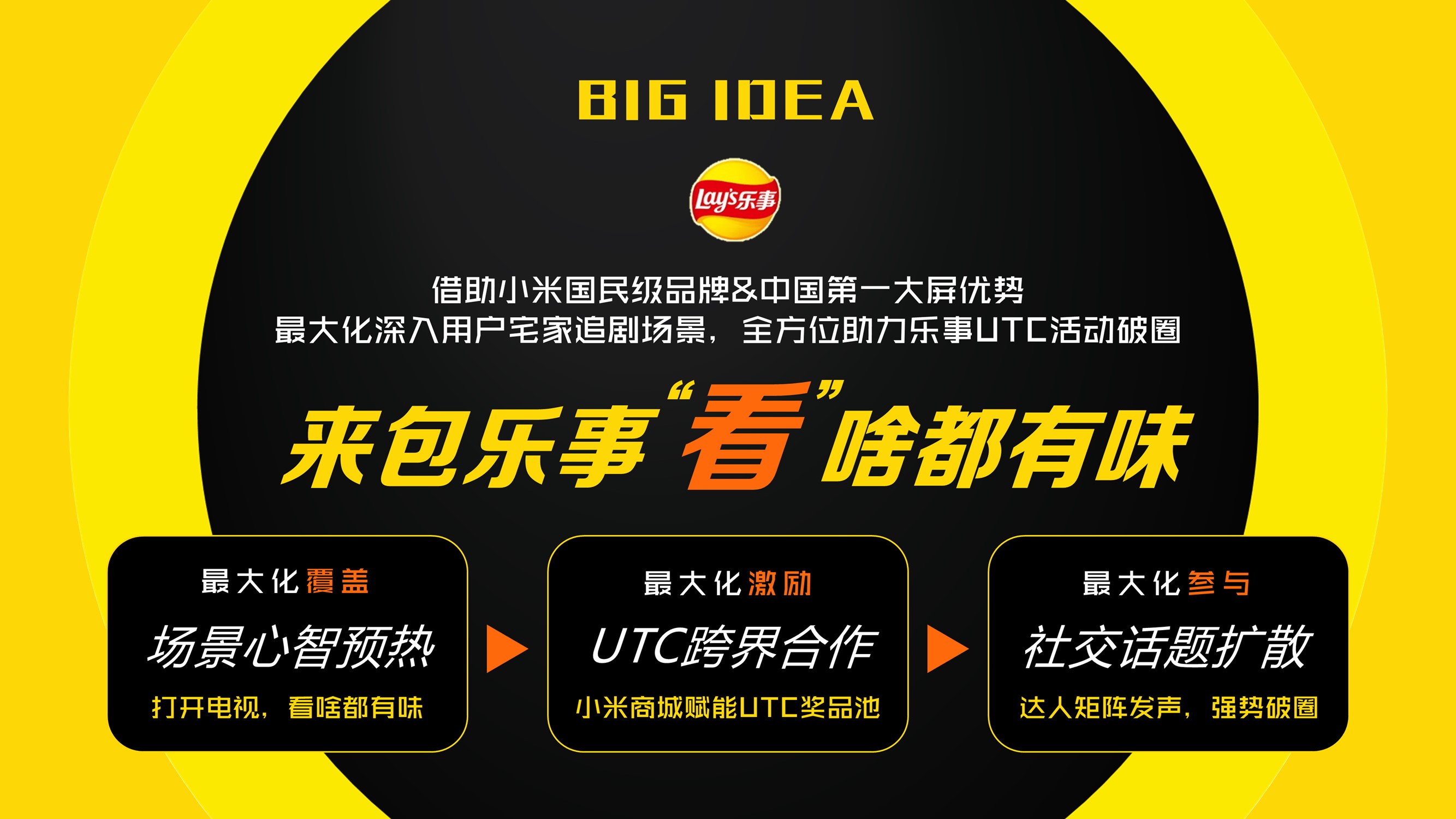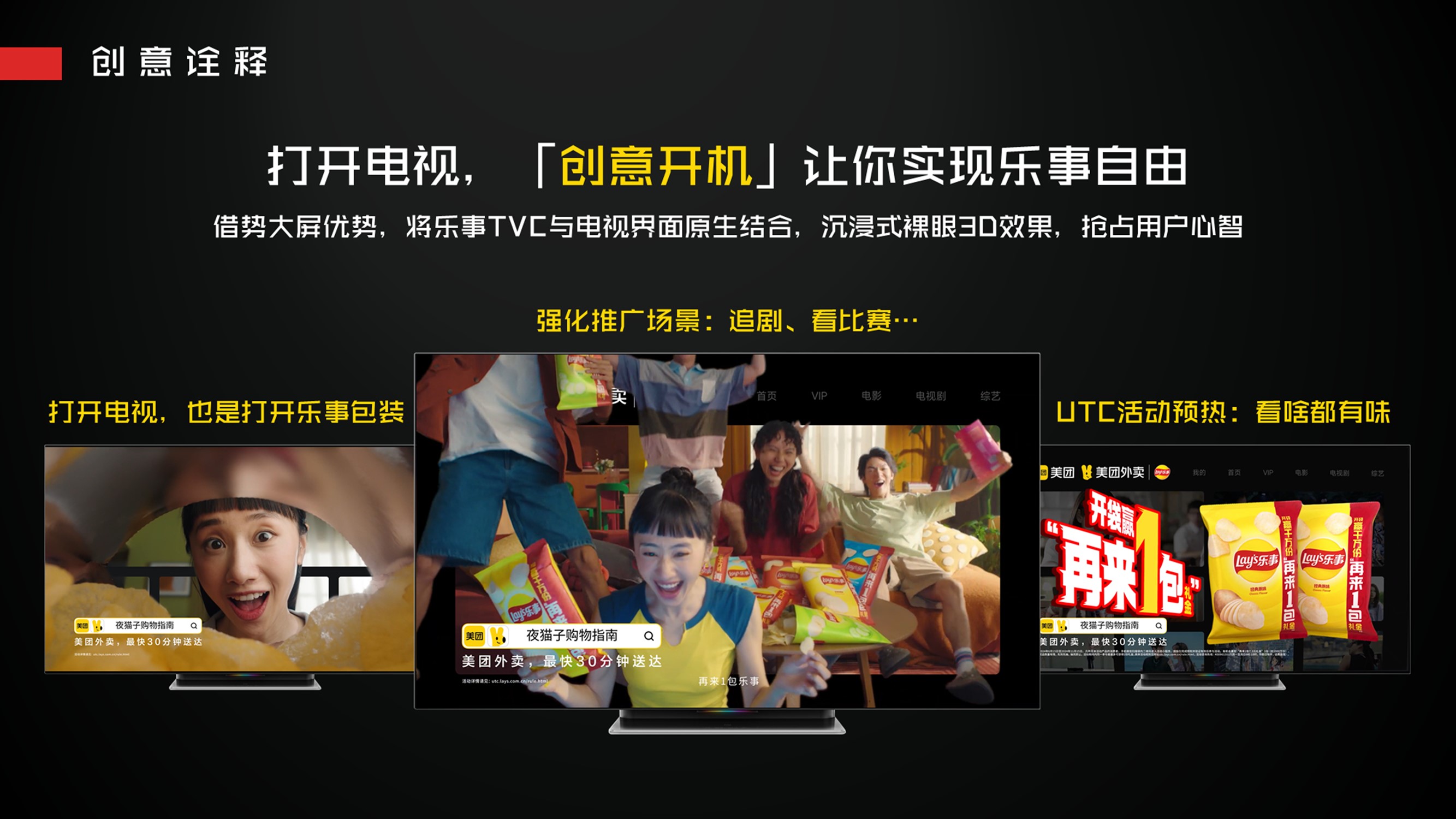 (1)场景预热:借助小米OTT大屏优势,将乐事TVC与OTT界面原生结合,强化追剧、看比赛等品牌推广场景,预热品牌赢再来一袋活动;