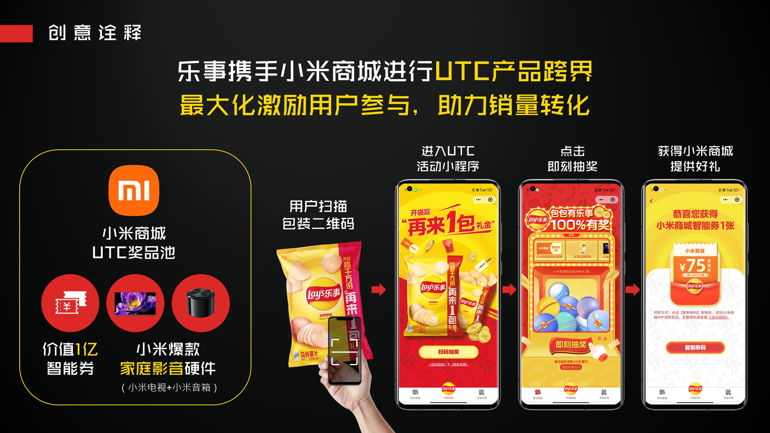 (2)赋能奖池:小米商城赋能价值1亿智能券及小米电视、音箱硬件UTC奖池,购买乐事薯片后扫描包装二维码进入活动小程序即可抽奖;