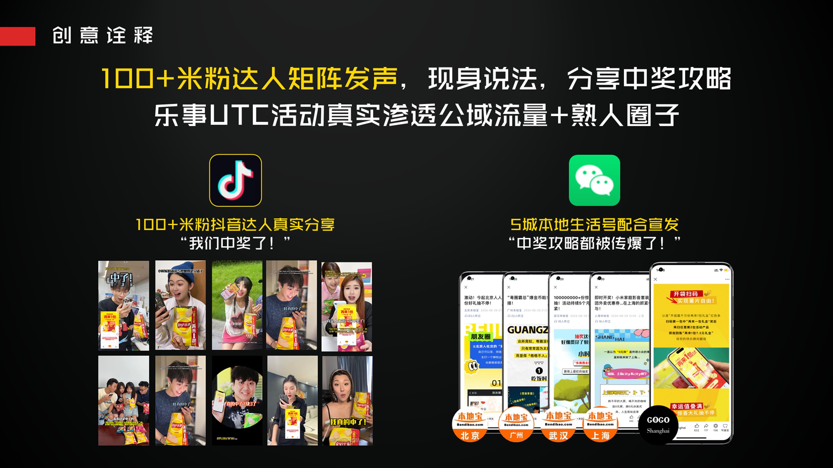 (3)话题扩散:100+米粉抖音达人矩阵分享中奖体验,四地本地生活号配合转发中奖攻略,利用米粉参与感,助力乐事UTC活动破圈。