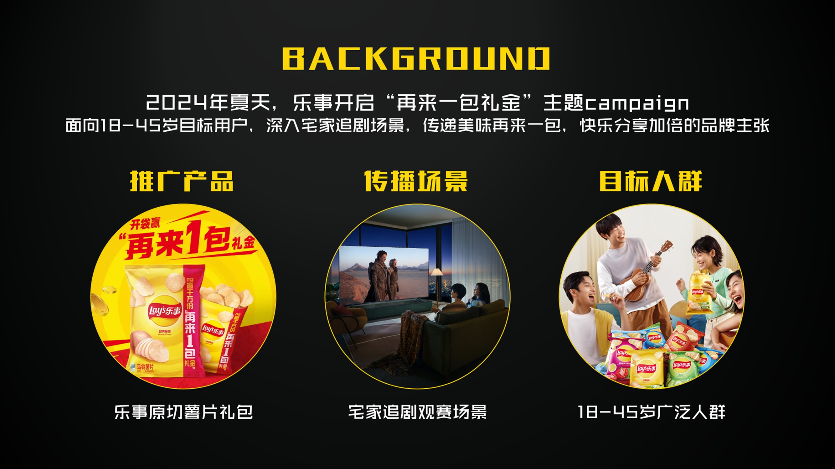 乐事“再来一包礼金”活动希望面向18-45岁目标用户推广乐事薯片礼包,强化乐事在宅家娱乐场景中的品类联想,传递“美味再来一包,快乐分享加倍”的品牌主张。