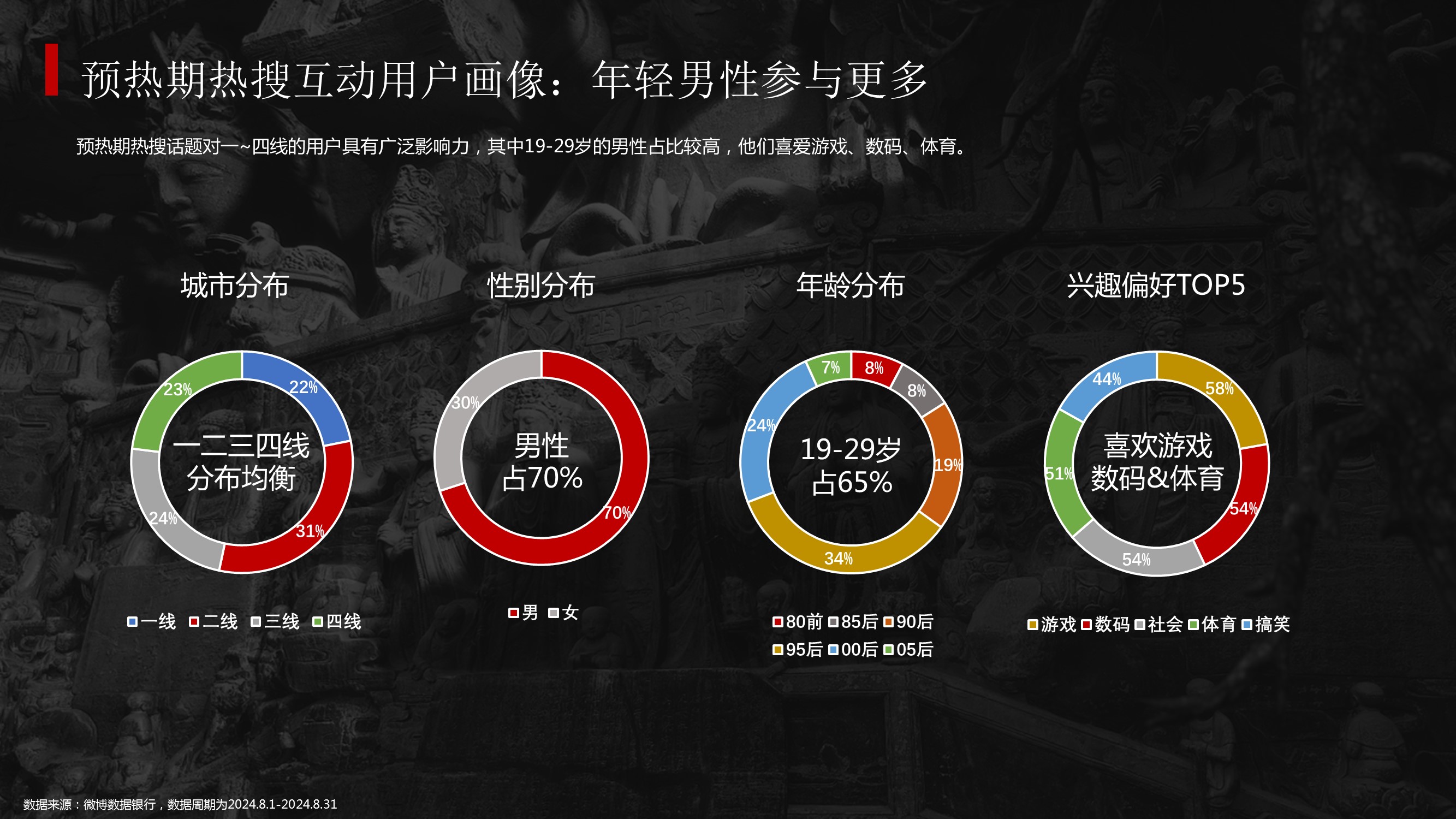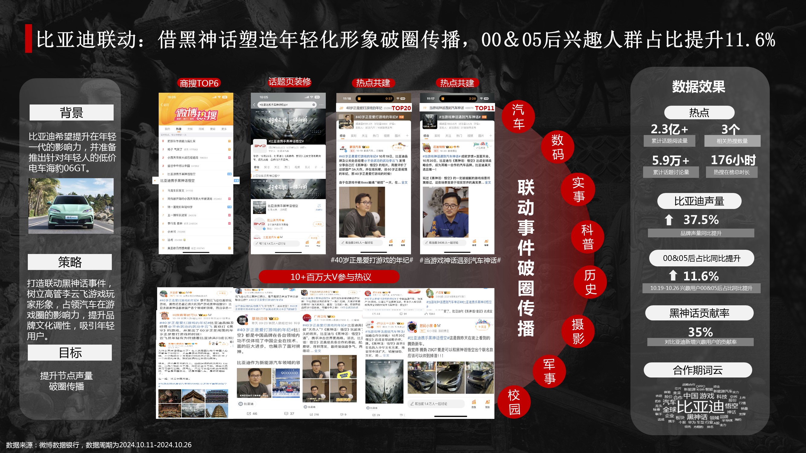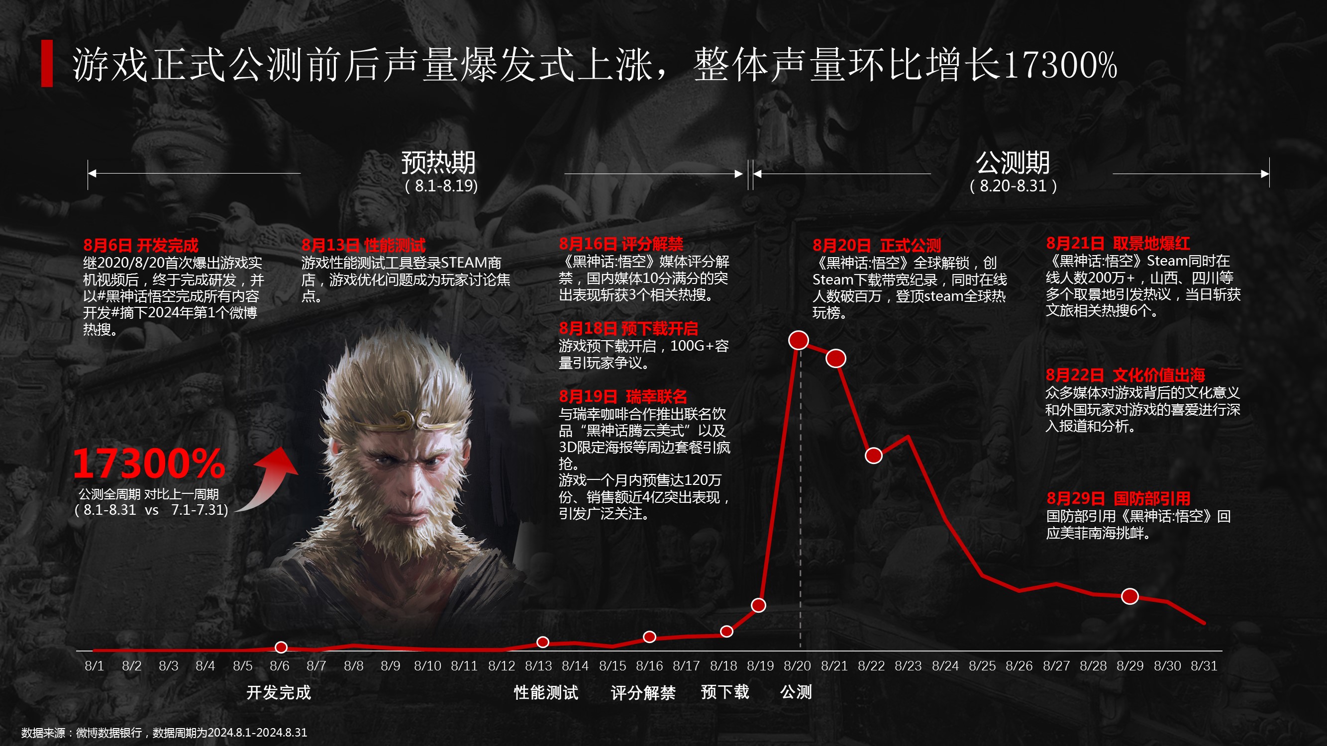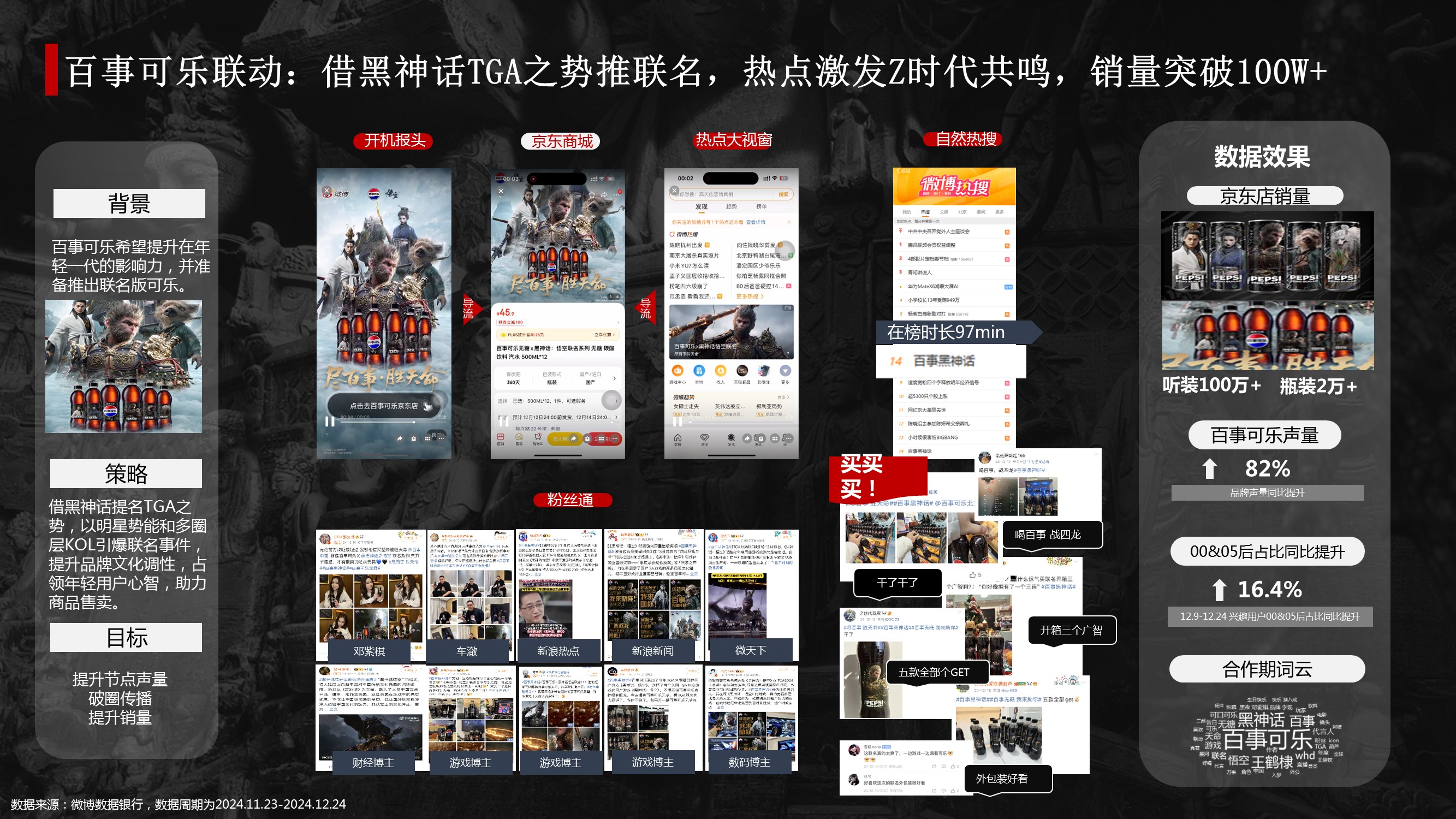游戏首月销量破2000W。公测当日斩获69个热搜,最高TOP1,火速成为现象级游戏。社会各界高度关注,中央政府大力支持,游戏垂媒&主播&中外玩家纷纷畅玩,快消、数码科技、娱乐明星、金融、文旅圈层皆加入热议,为黑神话悟空传递出的中国文化激动和震撼,大众讨论全面引爆热搜。游戏公测前后声量爆发式上涨,公测期整体声量环比增长17300%。合作期间,比亚迪00&05后兴趣人群占比同比提升11.6%,海豹06GT 2024年销量超1.2W台;百事可乐00&05后兴趣人群占比同比提升16.4%,联名可乐销量100W+。