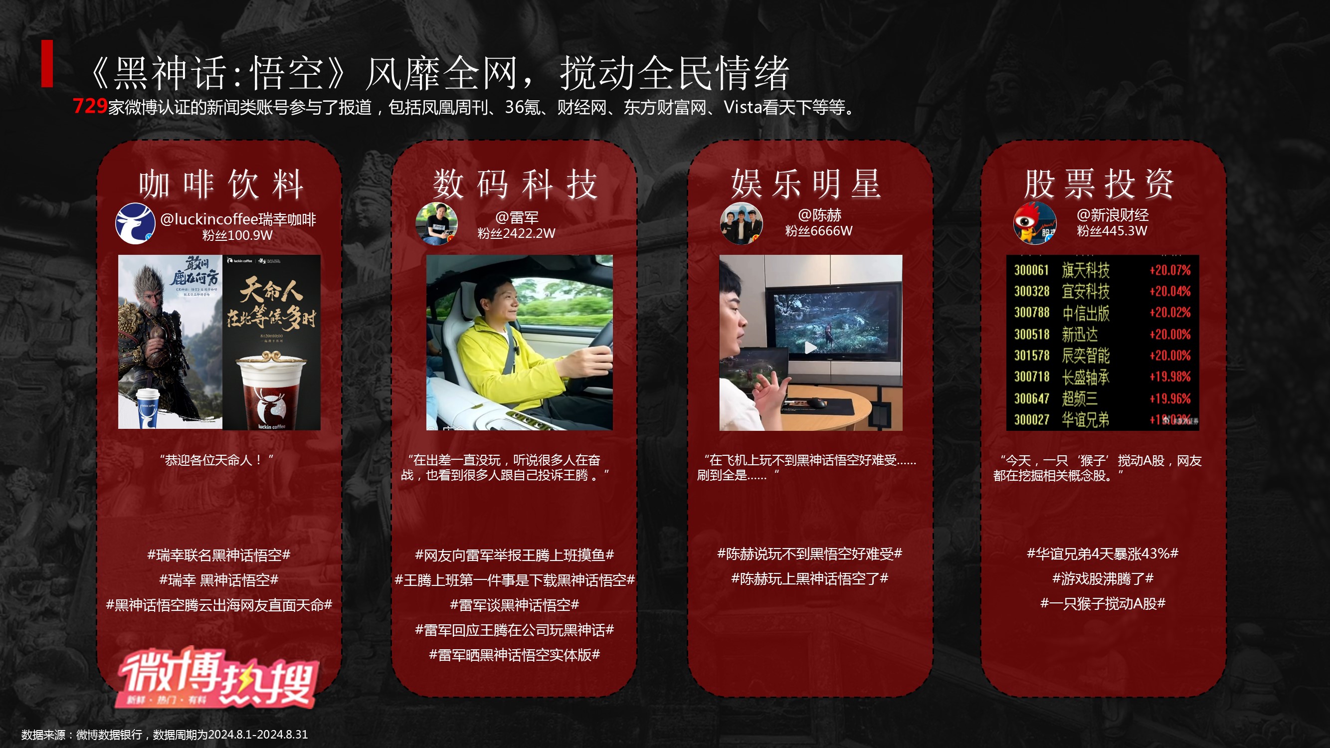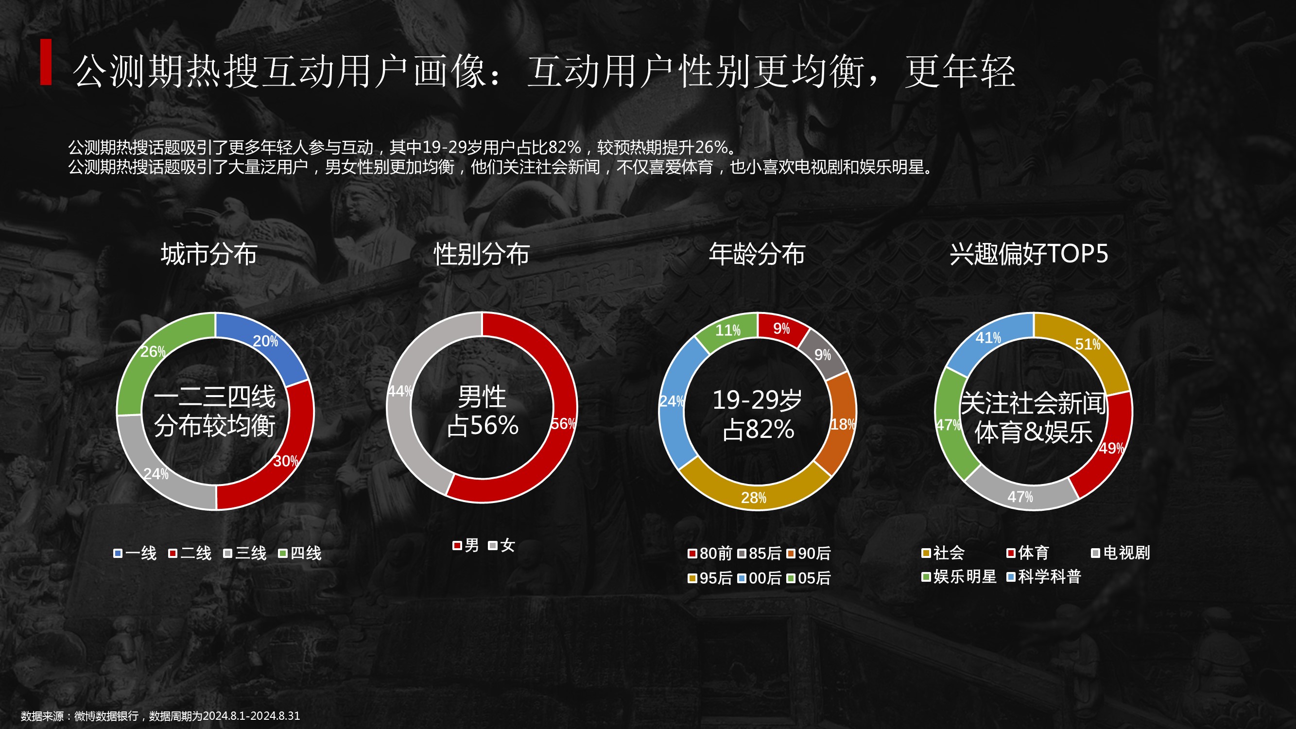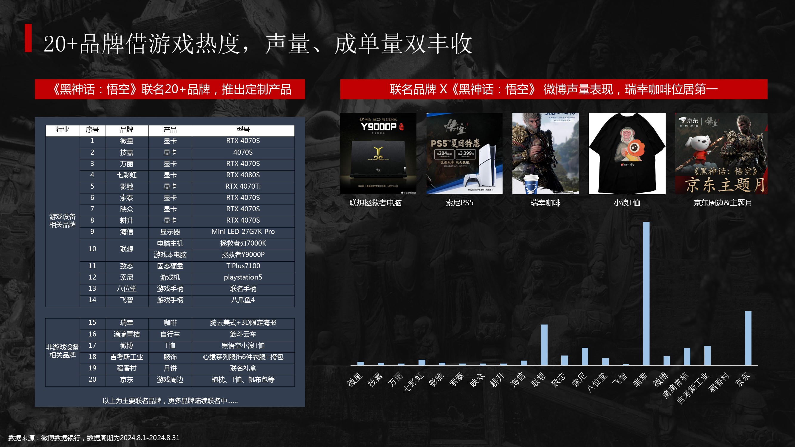 游戏首月销量破2000W。公测当日斩获69个热搜,最高TOP1,火速成为现象级游戏。社会各界高度关注,中央政府大力支持,游戏垂媒&主播&中外玩家纷纷畅玩,快消、数码科技、娱乐明星、金融、文旅圈层皆加入热议,为黑神话悟空传递出的中国文化激动和震撼,大众讨论全面引爆热搜。游戏公测前后声量爆发式上涨,公测期整体声量环比增长17300%。合作期间,比亚迪00&05后兴趣人群占比同比提升11.6%,海豹06GT 2024年销量超1.2W台;百事可乐00&05后兴趣人群占比同比提升16.4%,联名可乐销量100W+。