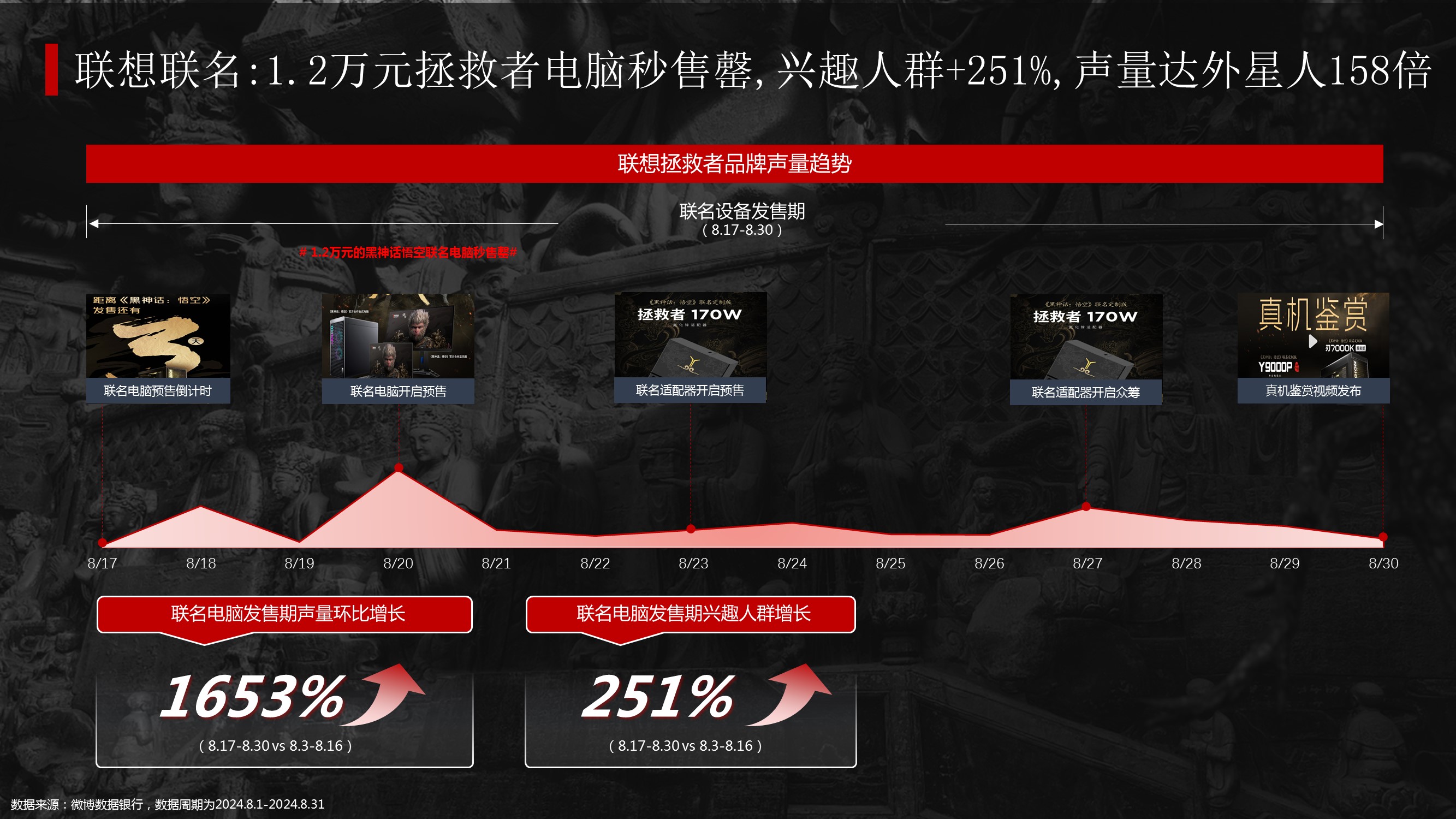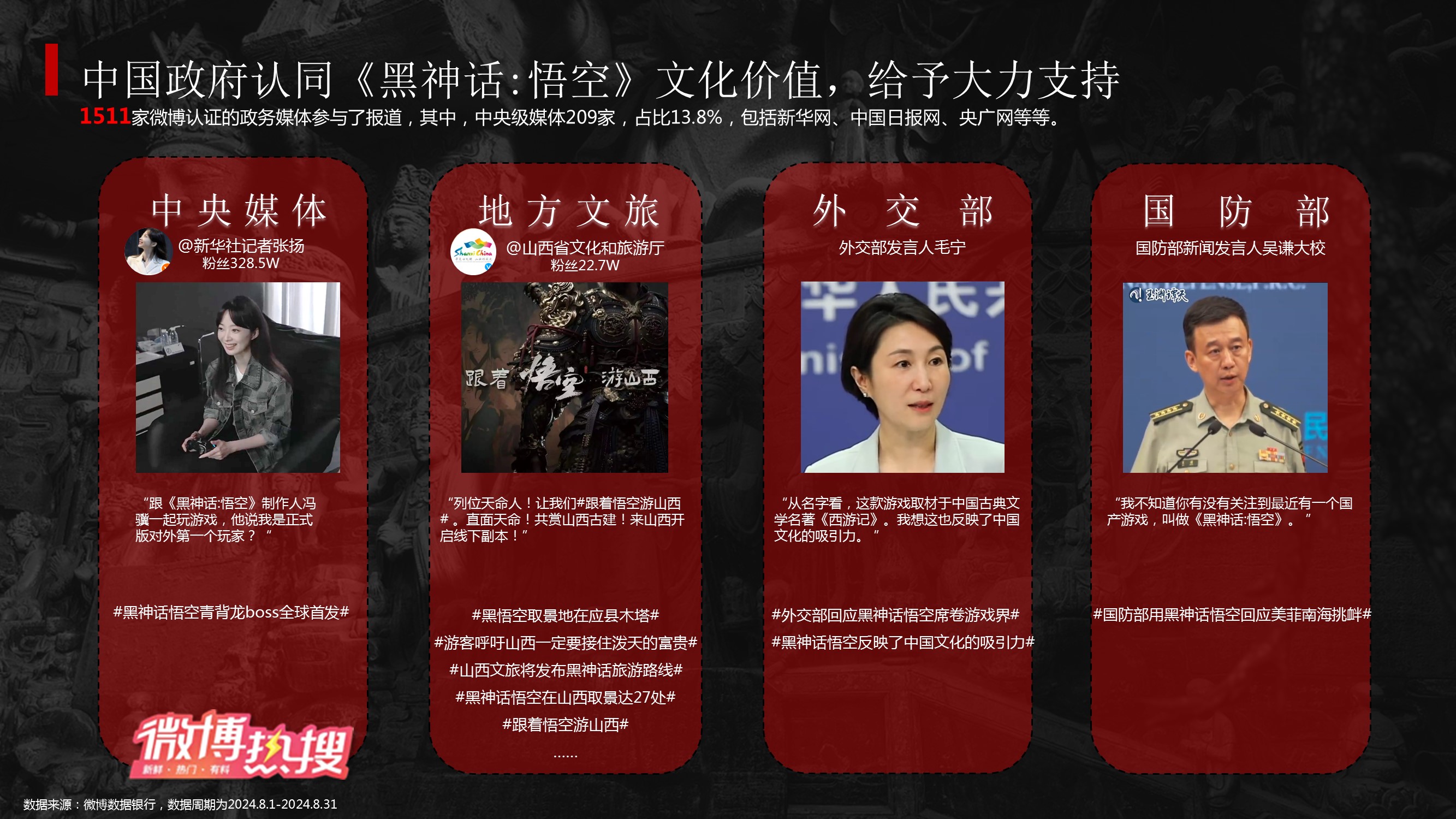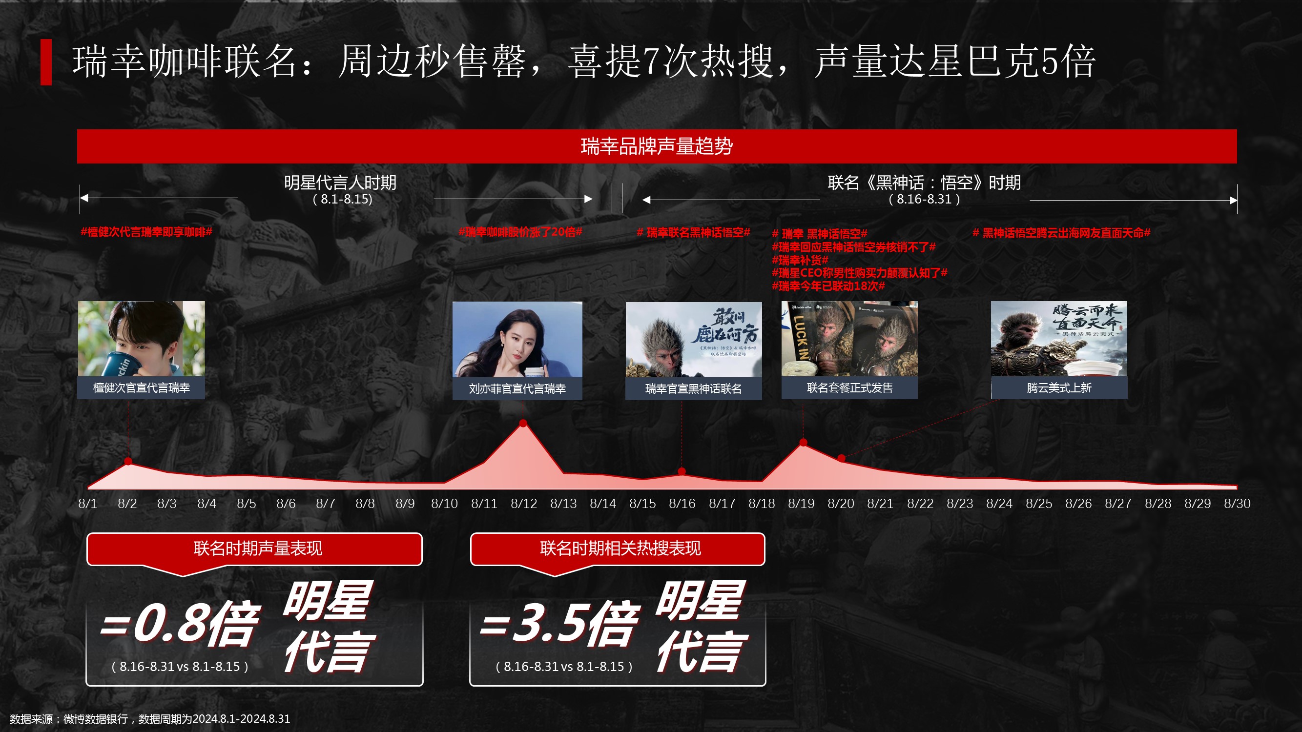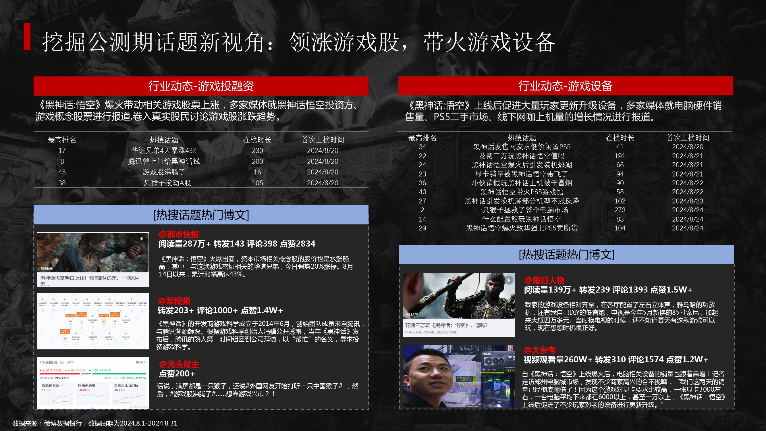 游戏首月销量破2000W。公测当日斩获69个热搜,最高TOP1,火速成为现象级游戏。社会各界高度关注,中央政府大力支持,游戏垂媒&主播&中外玩家纷纷畅玩,快消、数码科技、娱乐明星、金融、文旅圈层皆加入热议,为黑神话悟空传递出的中国文化激动和震撼,大众讨论全面引爆热搜。游戏公测前后声量爆发式上涨,公测期整体声量环比增长17300%。合作期间,比亚迪00&05后兴趣人群占比同比提升11.6%,海豹06GT 2024年销量超1.2W台;百事可乐00&05后兴趣人群占比同比提升16.4%,联名可乐销量100W+。