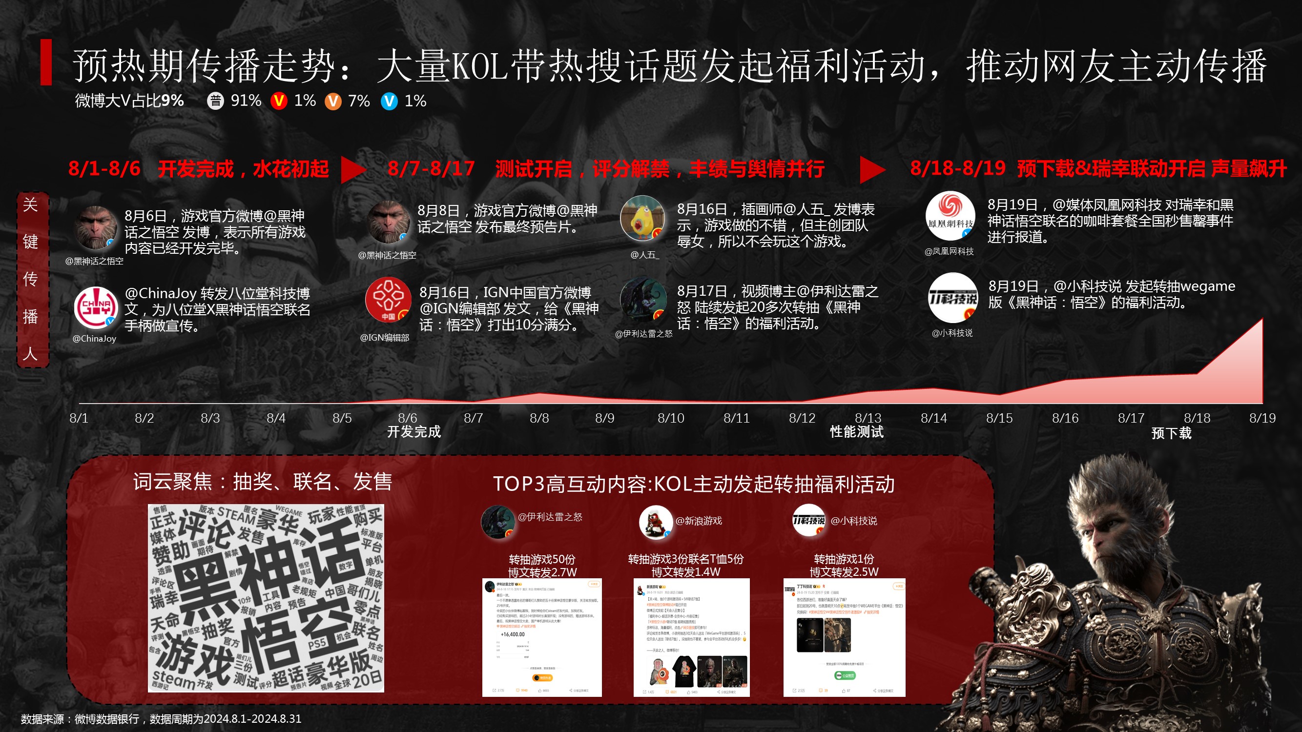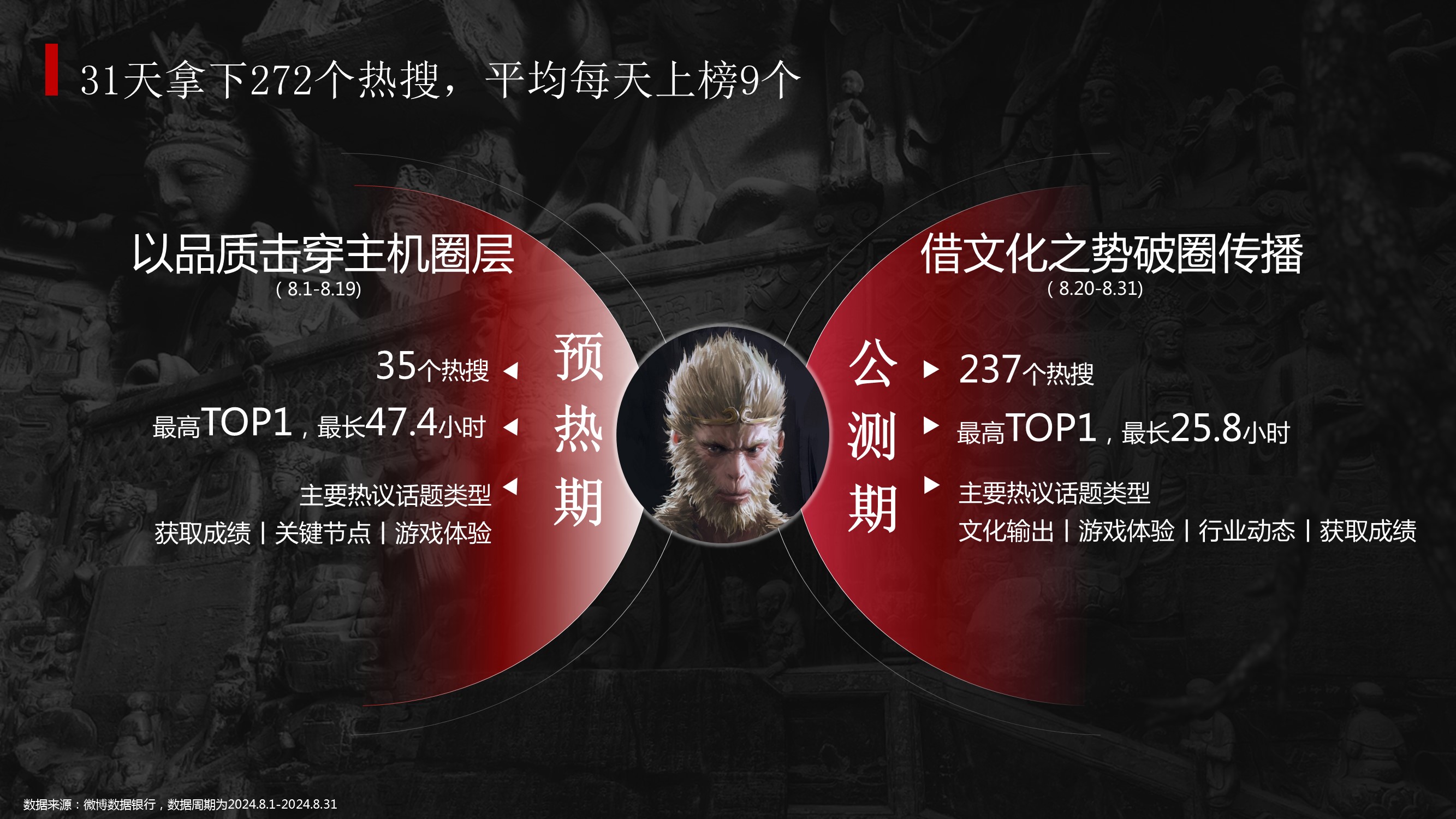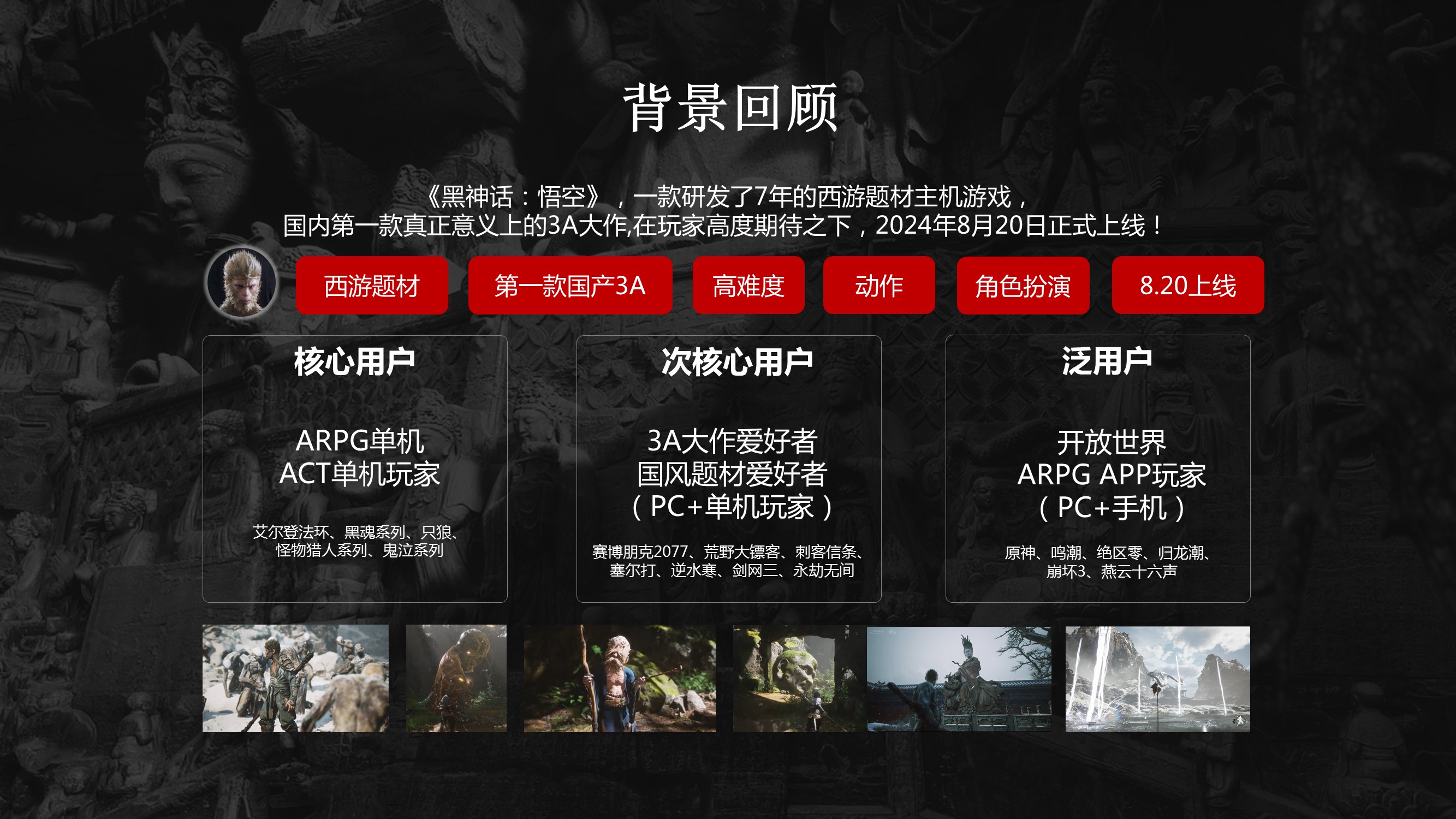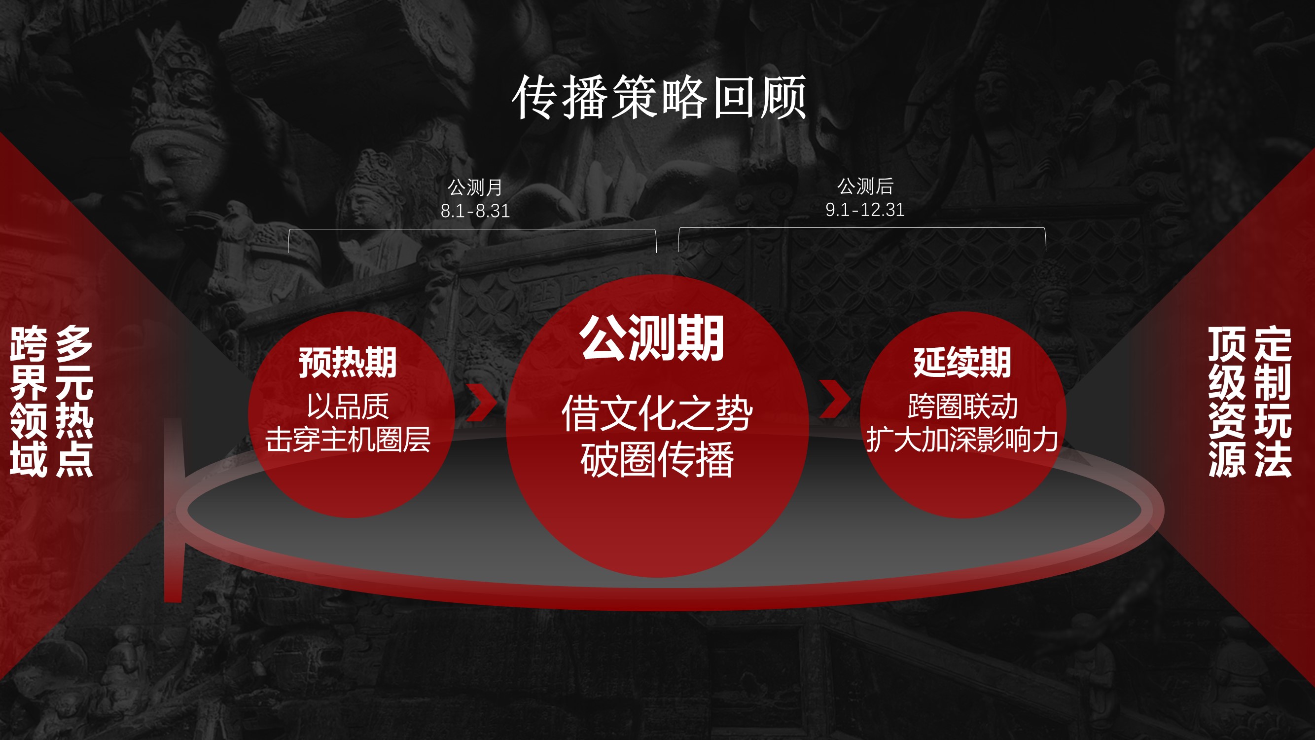 公测预热期,以游戏品质击穿主机+游戏圈层,触达核心+次核心用户;公测期,多元热点+跨领域KOL全面引爆,借中国文化之势破圈传播,触达泛用户+辐射西游题材爱好者和家国情怀者;延续期,以定制玩法和顶级资源助力跨圈联动,与比亚迪、百事可乐进行跨界联动,持续扩大加深IP影响力,加深与玩家的羁绊,吸引跨圈层兴趣用户。