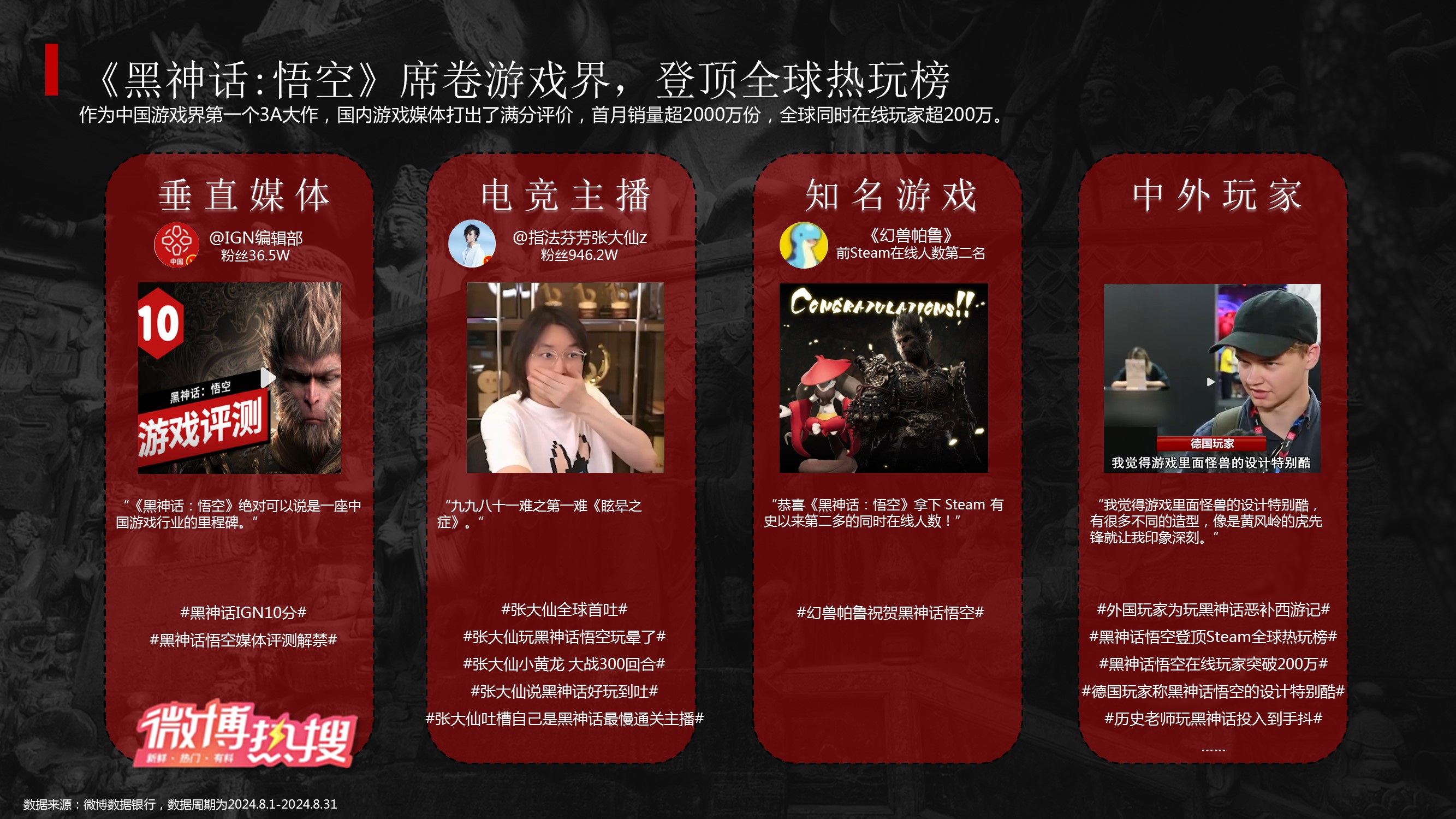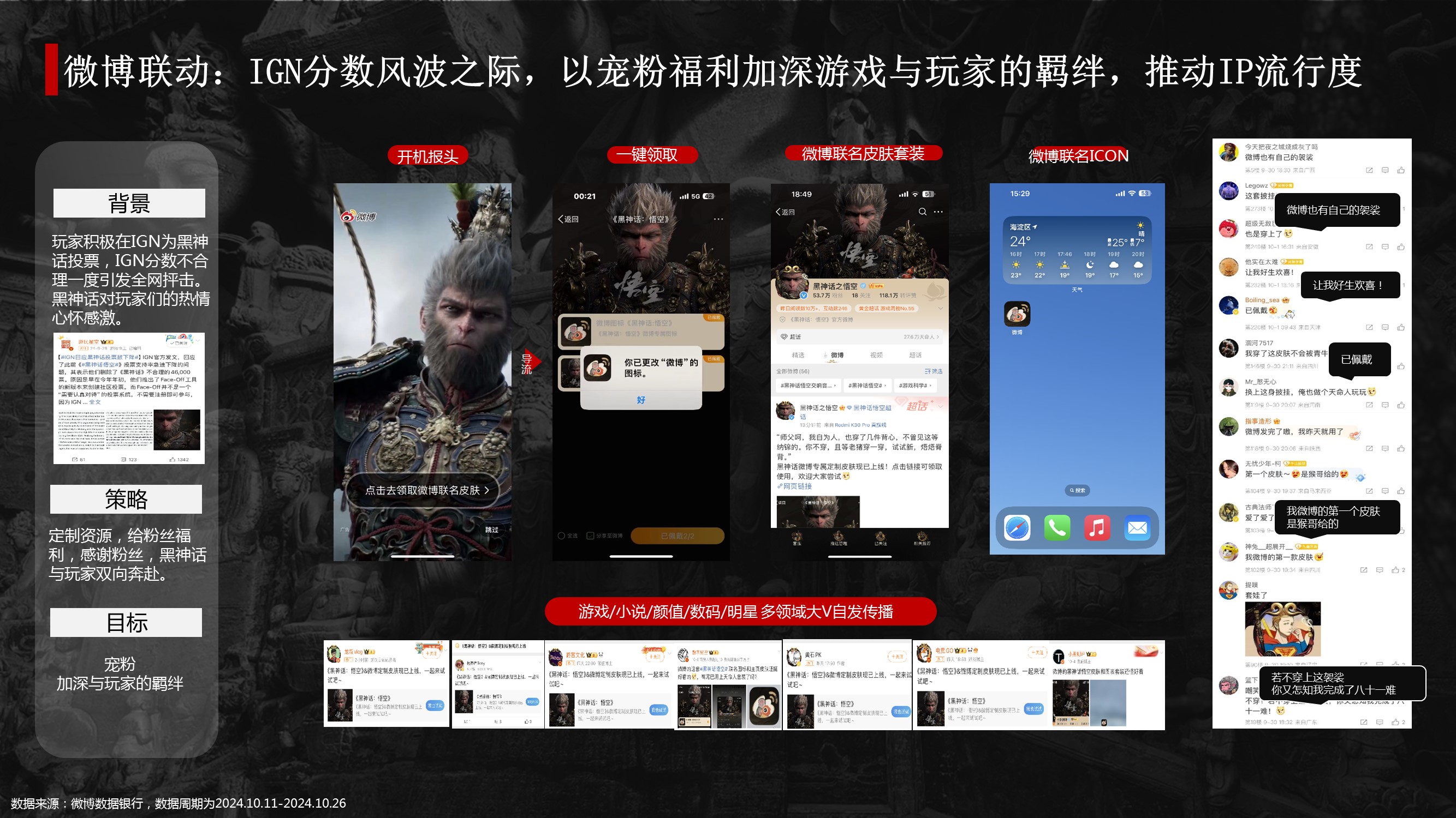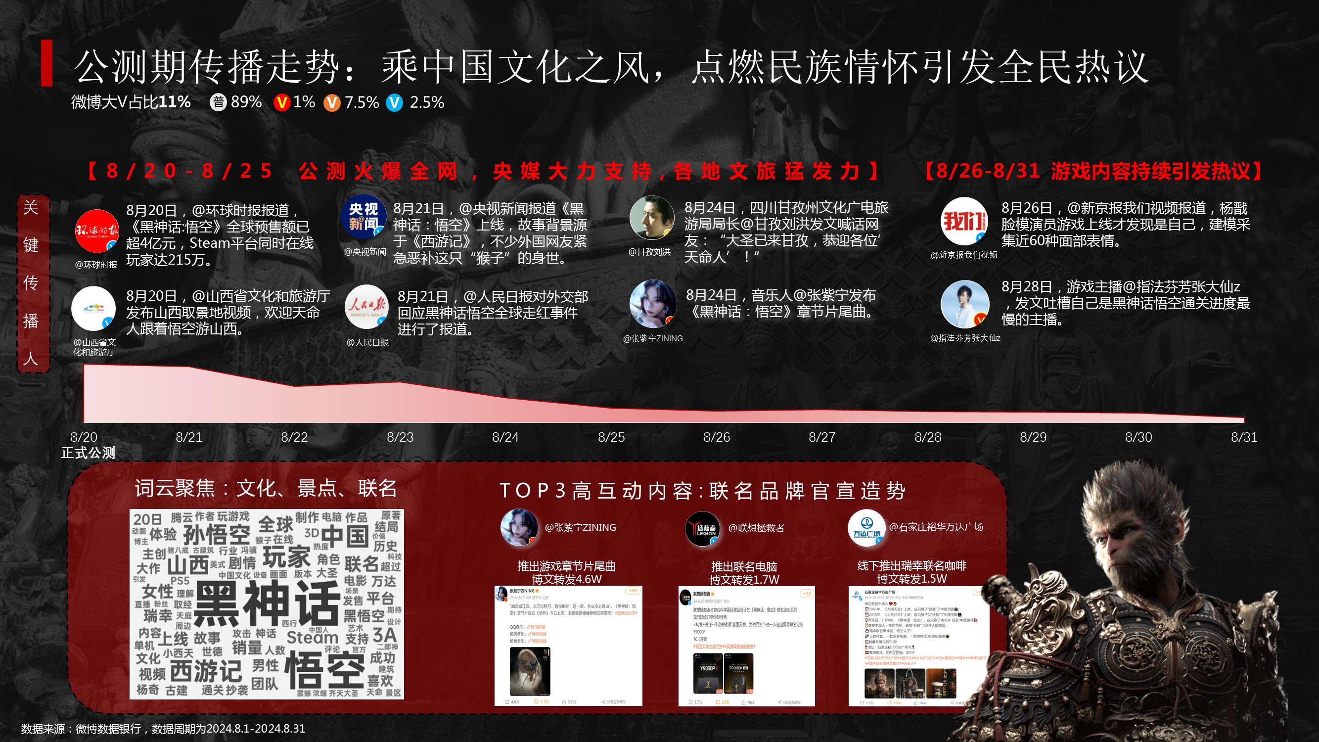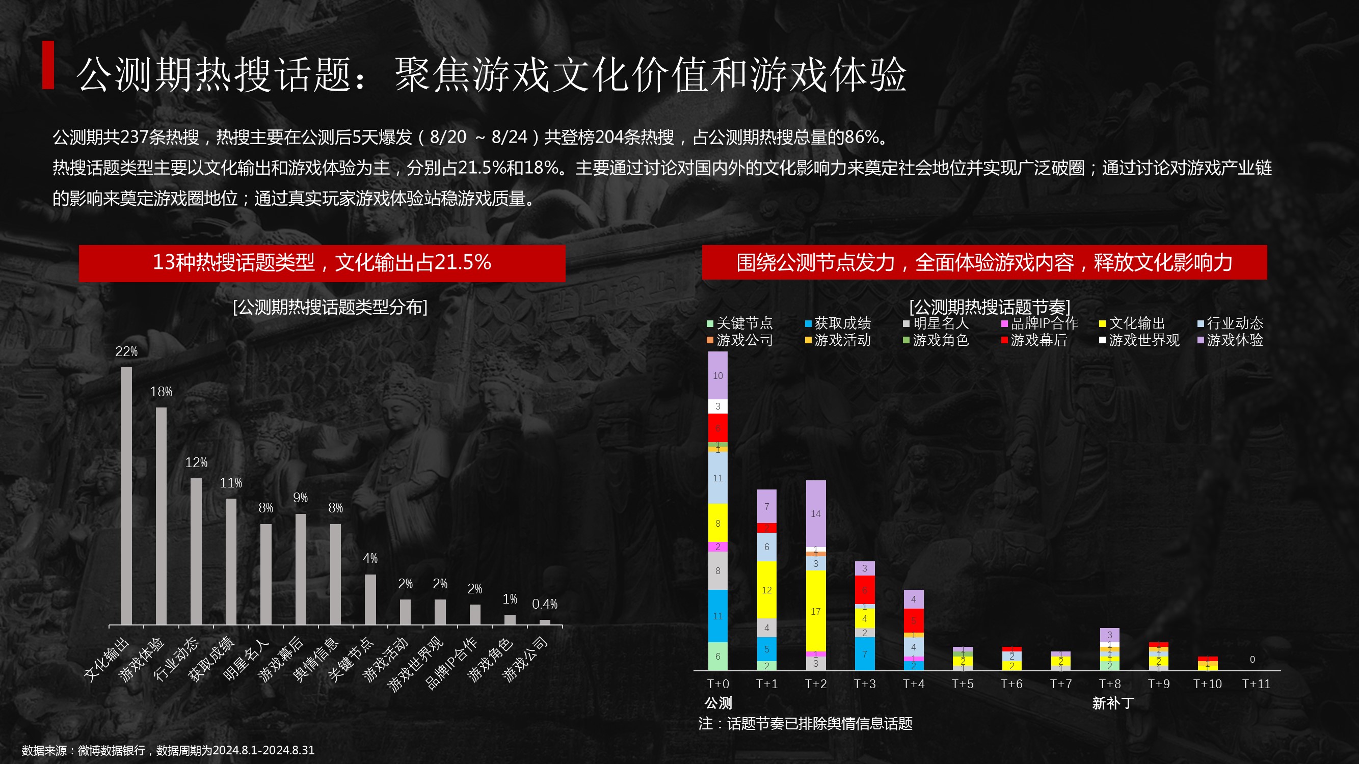 公测预热期,以游戏品质击穿主机+游戏圈层,触达核心+次核心用户;公测期,多元热点+跨领域KOL全面引爆,借中国文化之势破圈传播,触达泛用户+辐射西游题材爱好者和家国情怀者;延续期,以定制玩法和顶级资源助力跨圈联动,与比亚迪、百事可乐进行跨界联动,持续扩大加深IP影响力,加深与玩家的羁绊,吸引跨圈层兴趣用户。