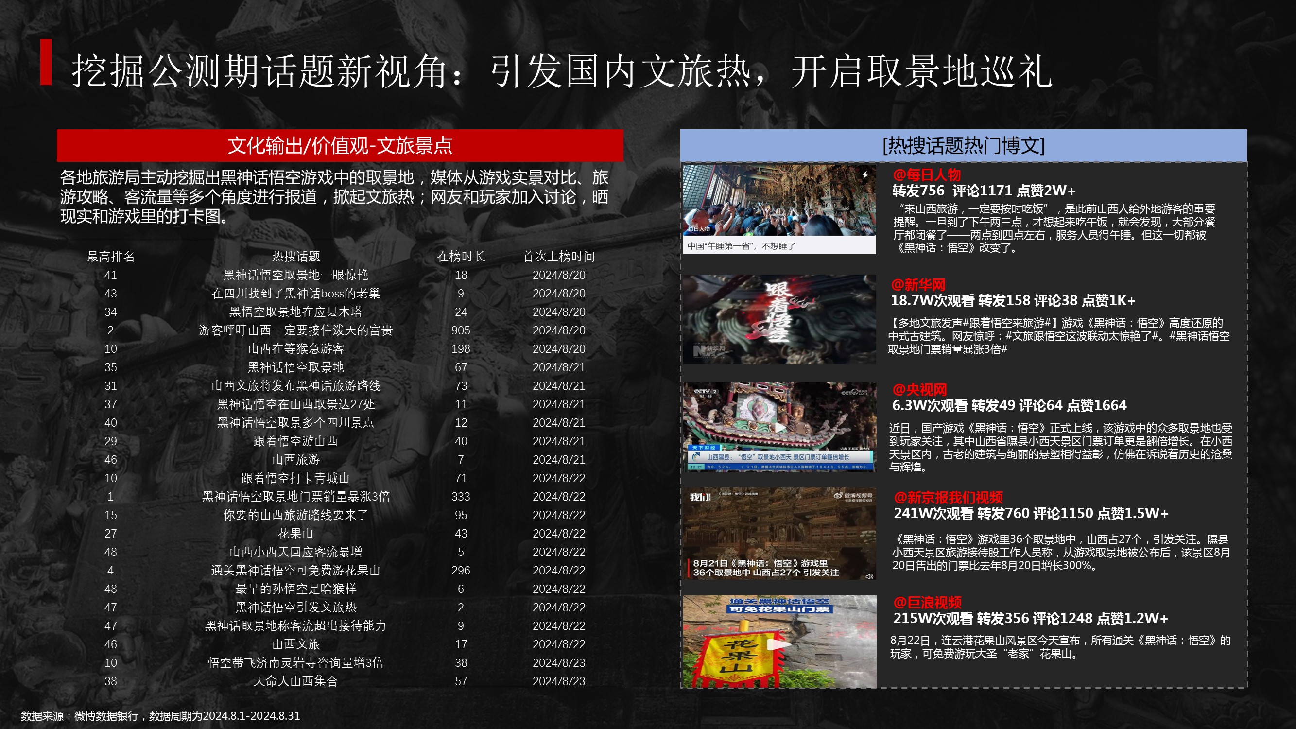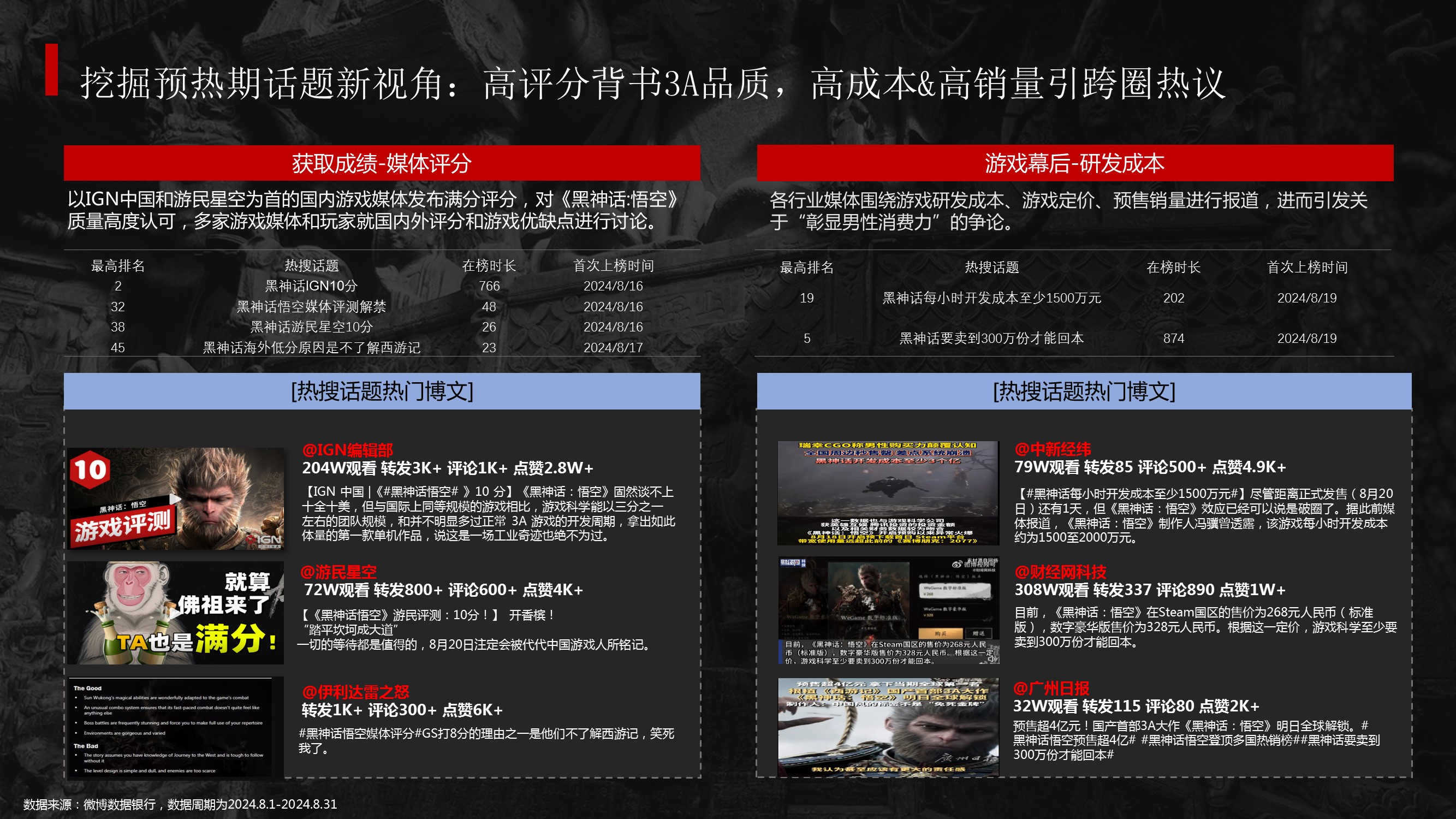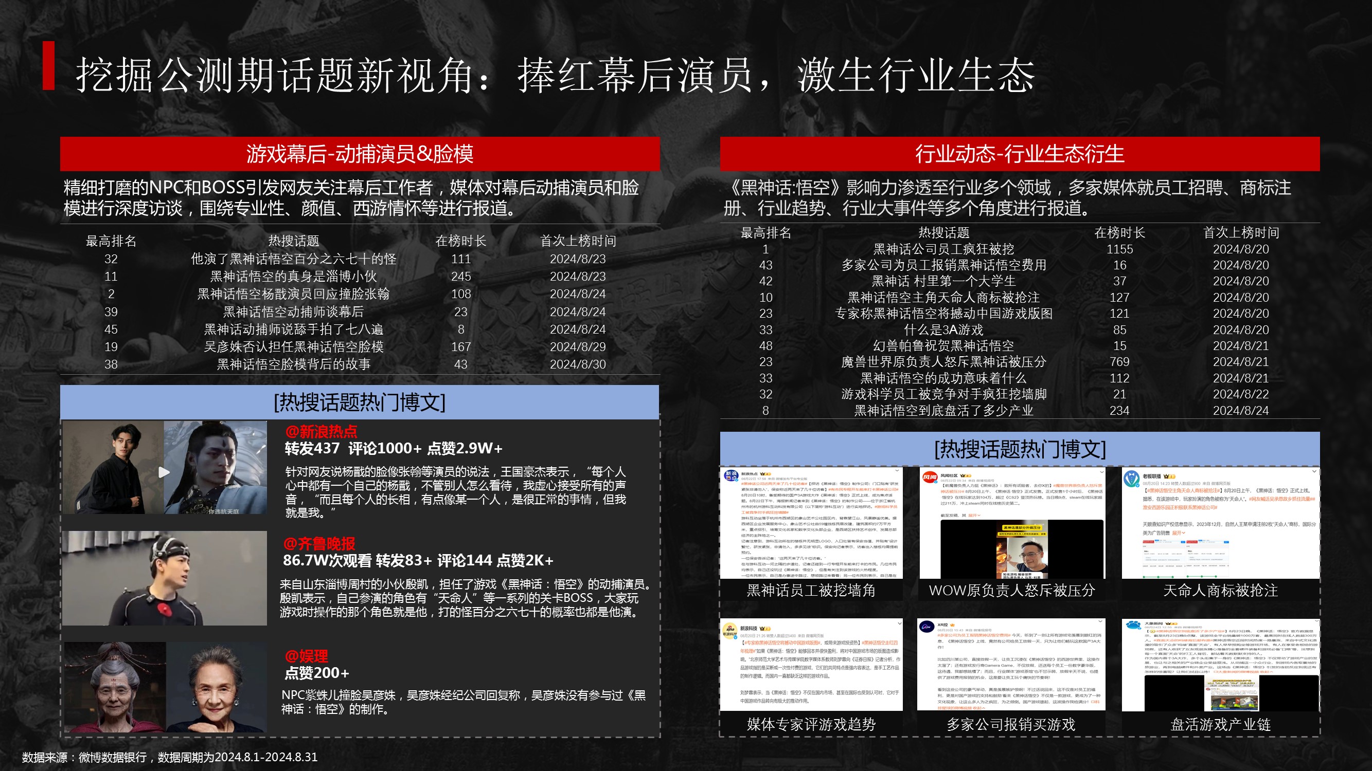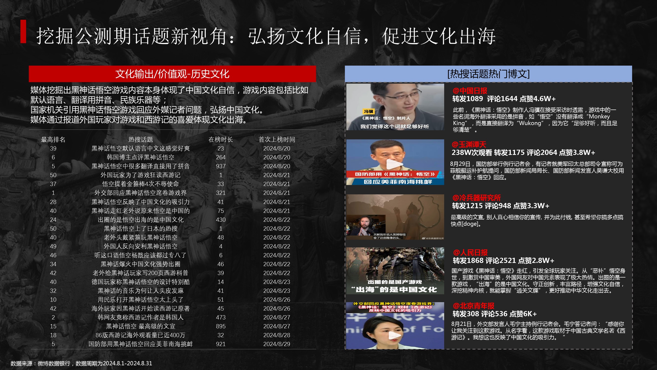 公测预热期,以游戏品质击穿主机+游戏圈层,触达核心+次核心用户;公测期,多元热点+跨领域KOL全面引爆,借中国文化之势破圈传播,触达泛用户+辐射西游题材爱好者和家国情怀者;延续期,以定制玩法和顶级资源助力跨圈联动,与比亚迪、百事可乐进行跨界联动,持续扩大加深IP影响力,加深与玩家的羁绊,吸引跨圈层兴趣用户。
