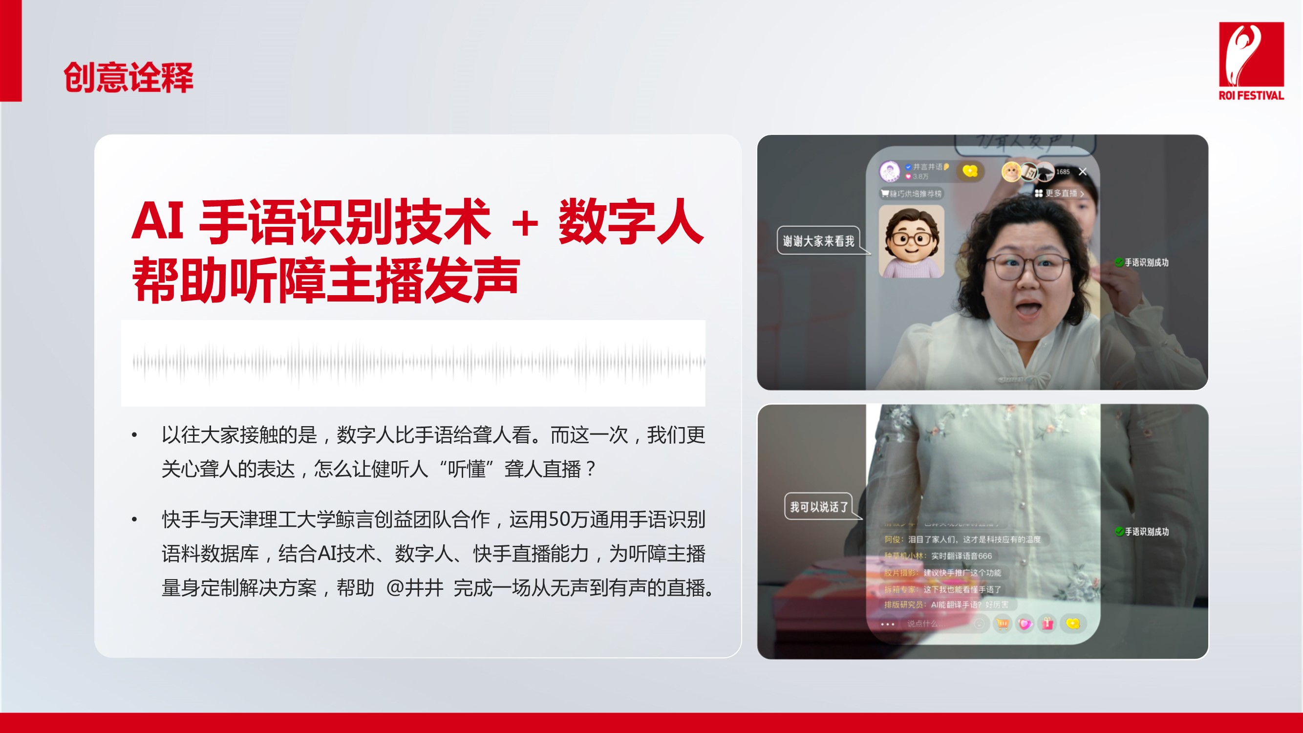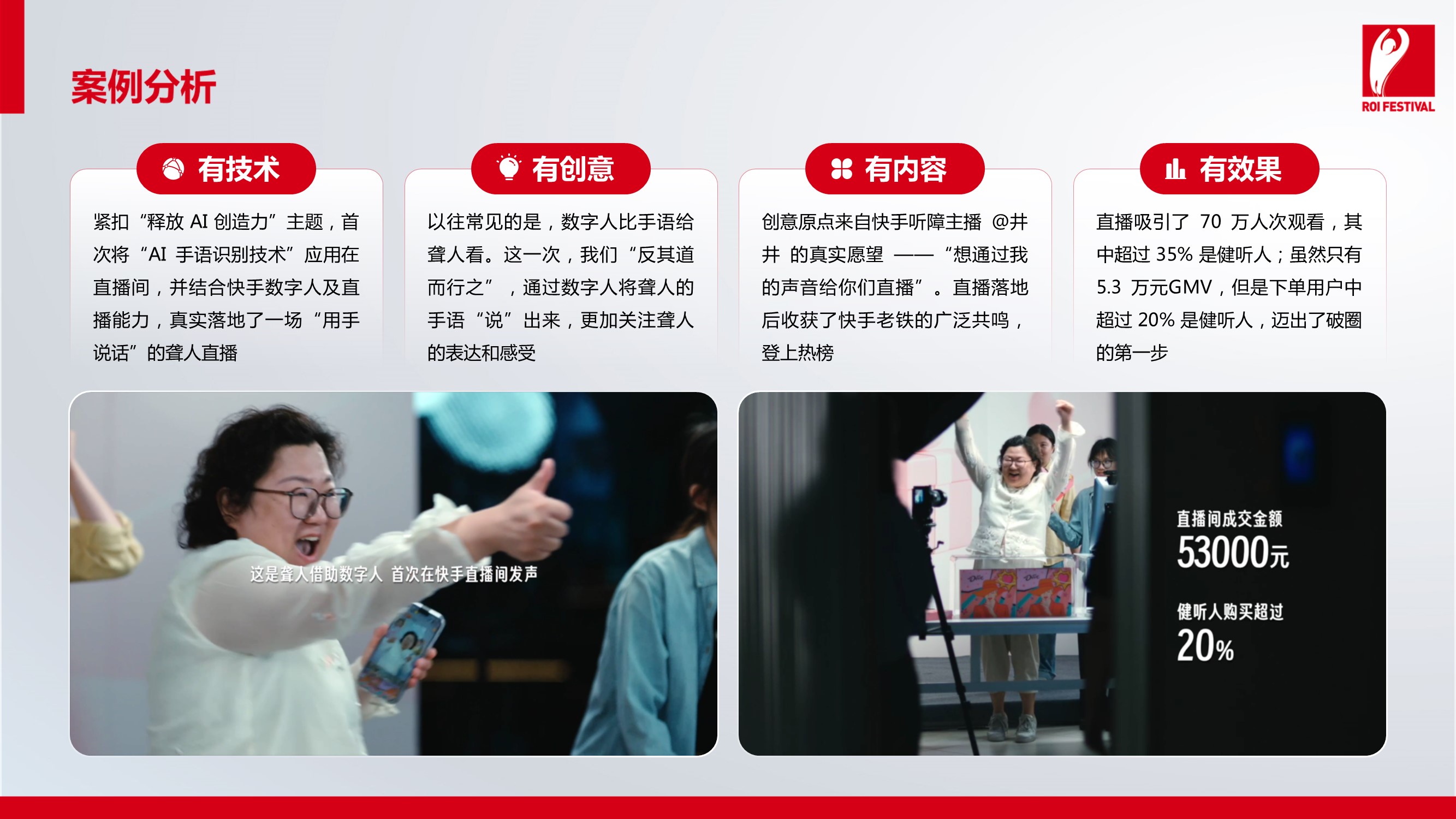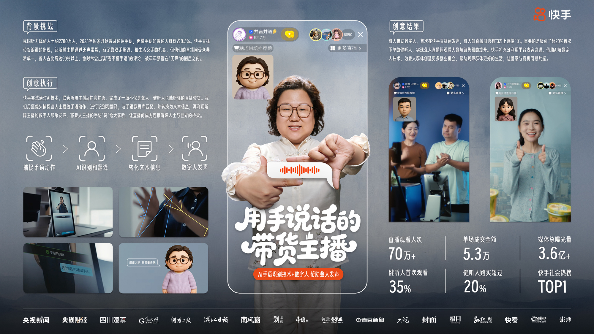 1、有技术:紧扣“释放AI创造力”主题,首次将“AI手语识别技术”应用在直播间,并结合快手数字人及直播能力,真实落地了一场“用手说话”的聋人直播;