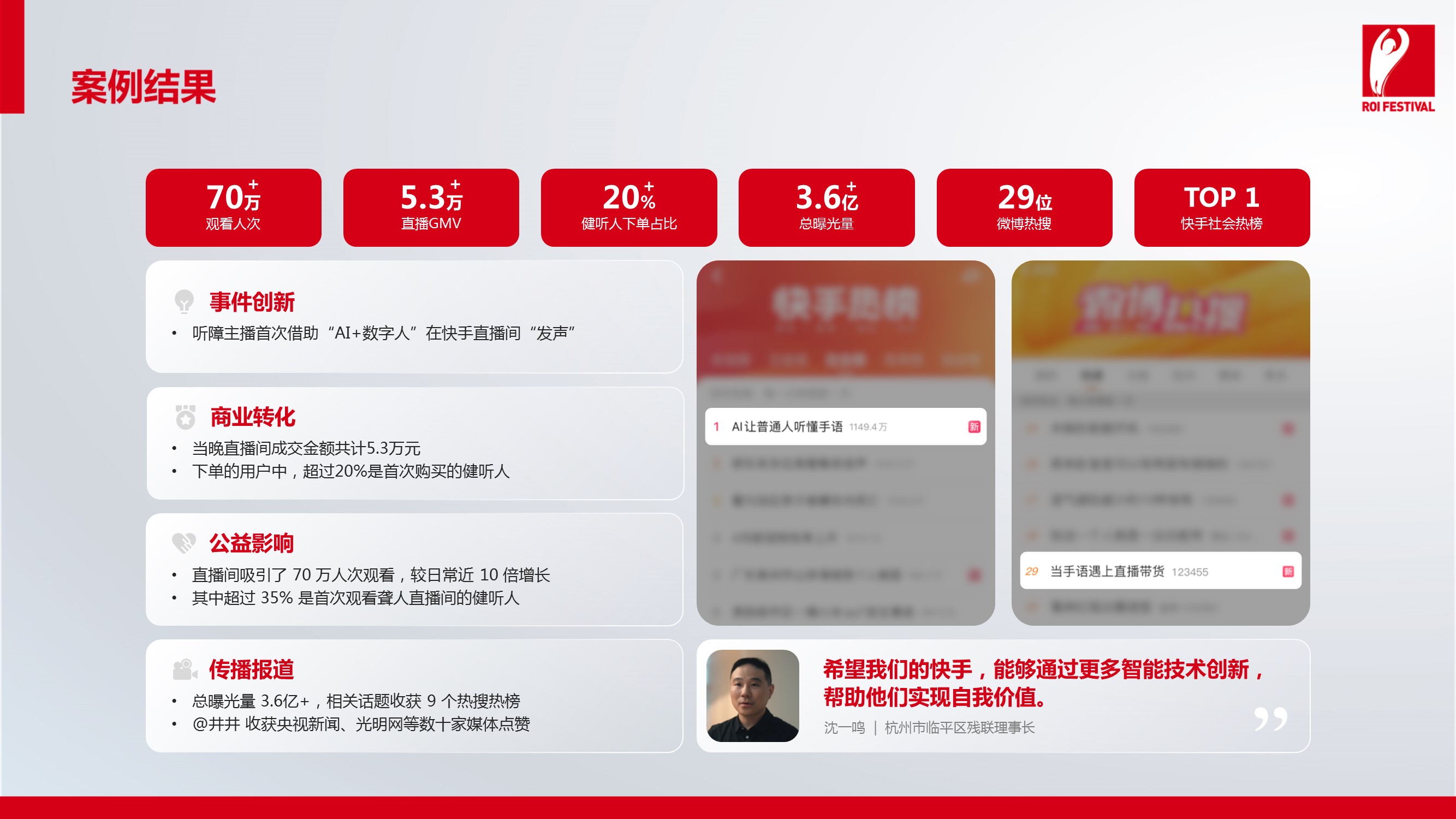 3、公益影响:直播间吸引了70万人次观看,较日常创造近10倍增长纪录,其中超过35%是首次观看聋人直播间的健听人;