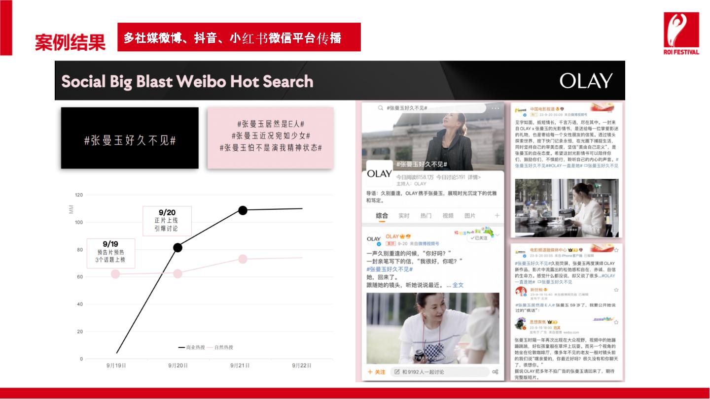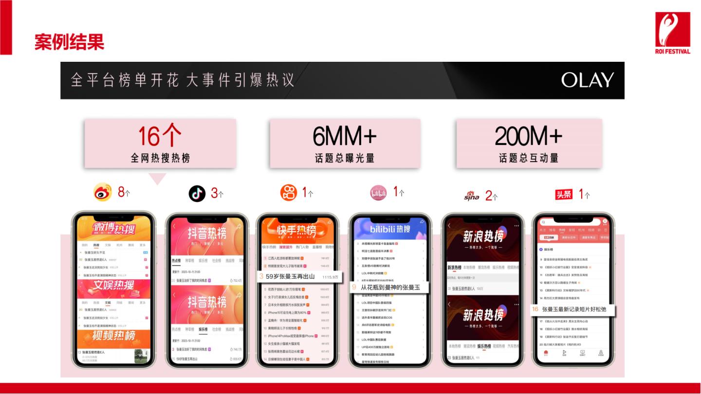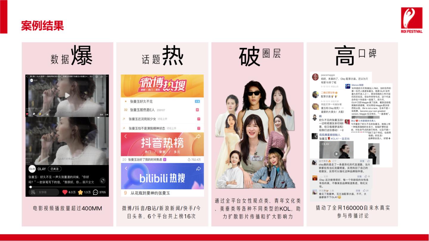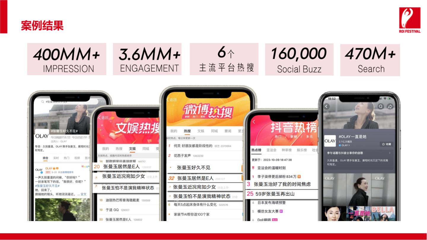 短片一经上线,打破了OLAY过往的营销传播记录,广告视频达4亿次观看。多平台热搜上榜共达16个,代言人提供品牌露出增量,话题总曝光量高达600万。搜索累计达4.7亿次,社交讨论达16w。除了社交爆发外,抖音直播、小红书种草上销量也都都获得了全面提升。