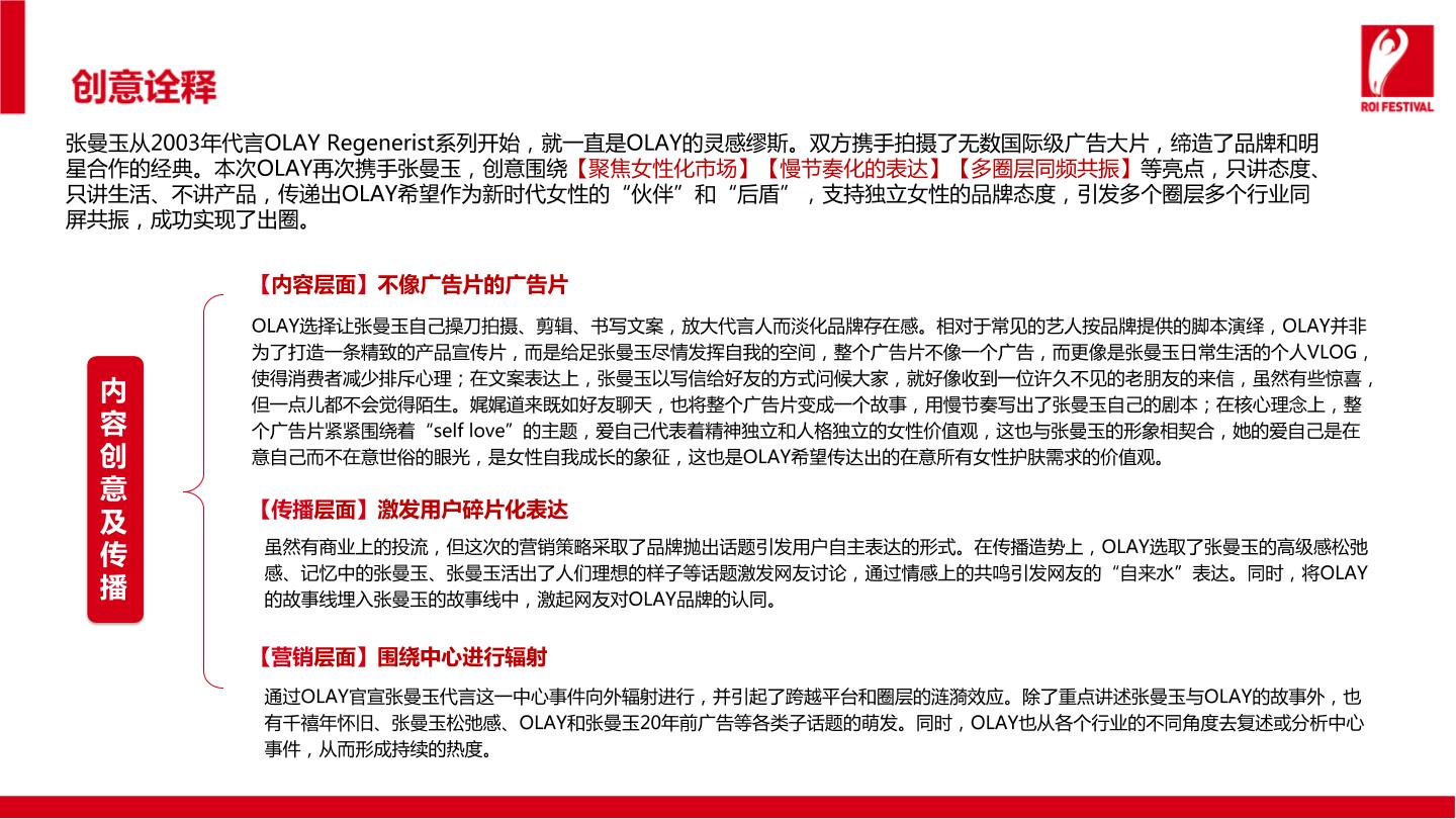 OLAY并没有采取同质化的赞助、争相与顶流合作代言、以及恐吓式焦虑贩卖,而是选择了很“OLAY”的方式——与国民级女神一起共创了关于女性价值观真实展现且透传的,一支不像广告的广告片,在喧嚣的娱乐激活市场中让大家看到别具一格的“OLAY风格”。在这份共创中,认认真真的讲述了OLAY品牌对于女性的价值观,不夸大、不贩卖焦虑、不卖心灵鸡汤,而是认真朴实的,通过张曼玉自然松弛的生活与优雅从容的娓娓道来,去传递。这种「共创」是双方抱有对对方的高度信任和认可,让用户体验并感知到品牌与艺人之间合作的美好与期待。