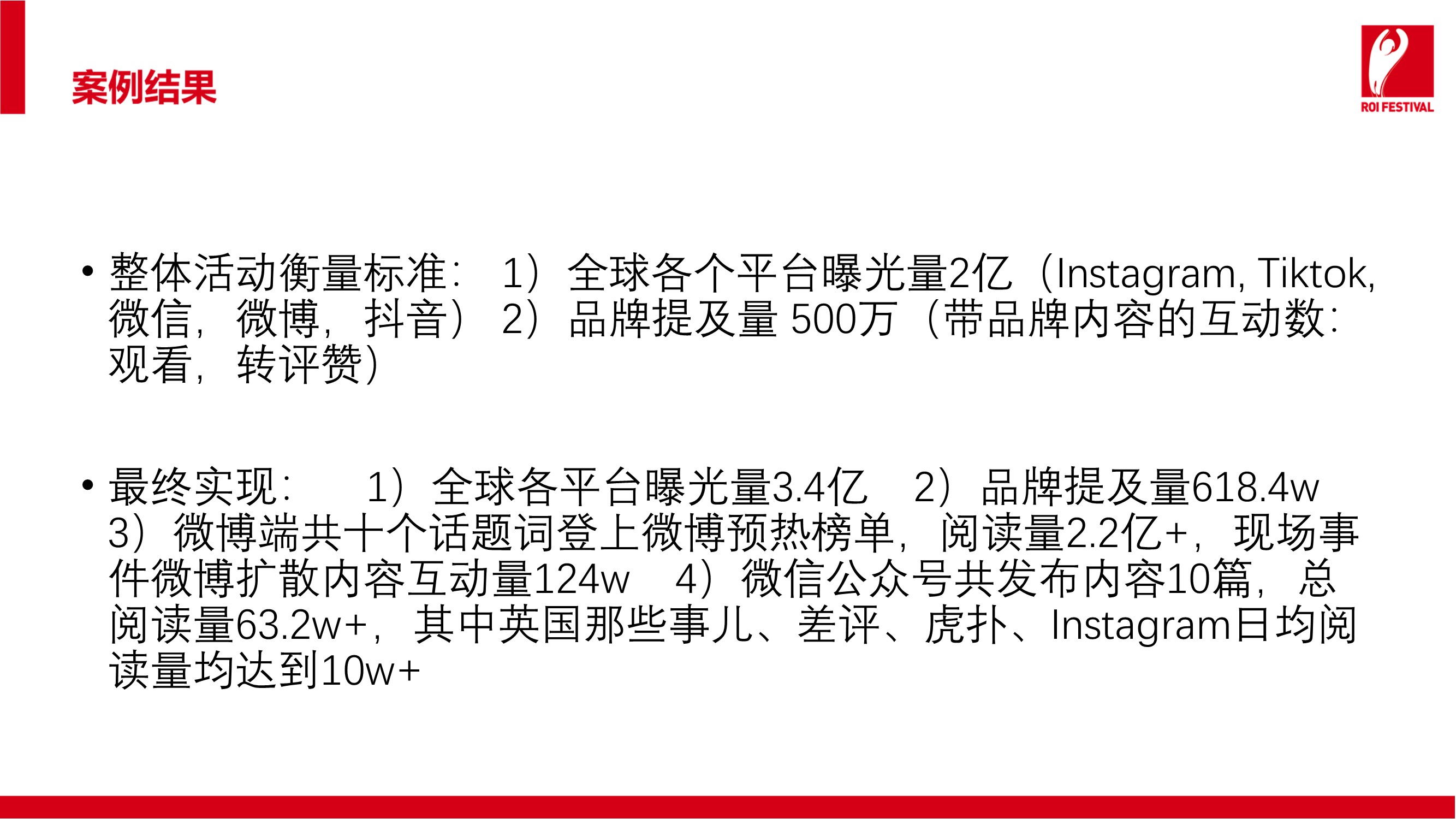 整体活动衡量标准: 1)全球各个平台曝光量2亿(Instagram, Tiktok, 微信,微博,抖音) 2)品牌提及量 500万(带品牌内容的互动数:观看,转评赞)